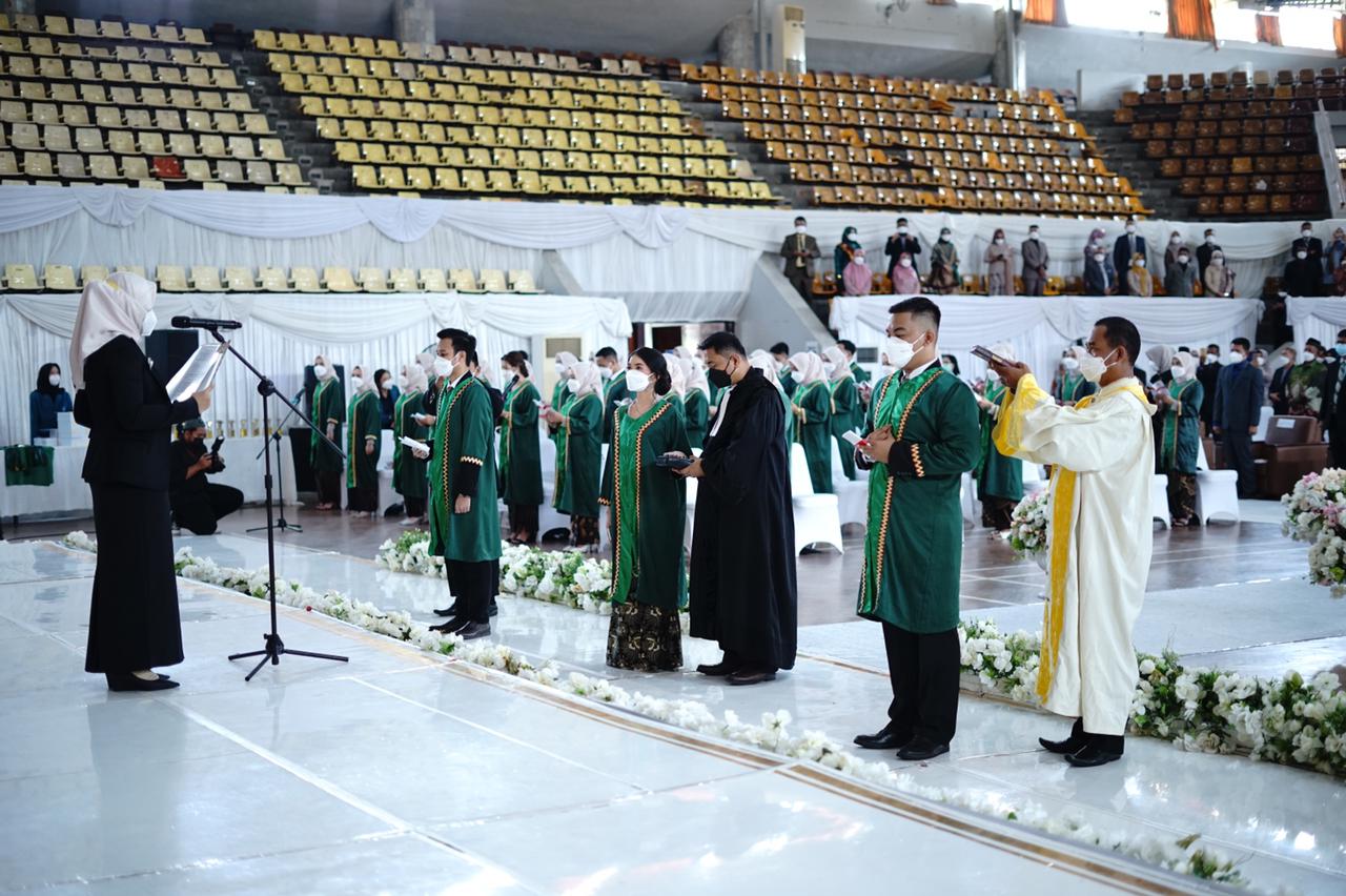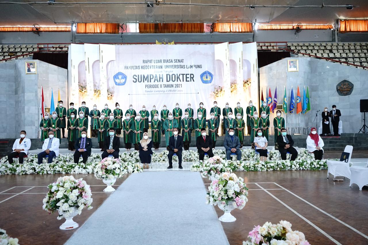 (Unila): 142 mahasiswa kedokteran Fakultas Kedokteran (FK) Universitas Lampung (Unila) melakukan Pengambilan Sumpah Program Profesi Dokter Periode II Tahun 2021, Rabu, 6 Oktober 2021.