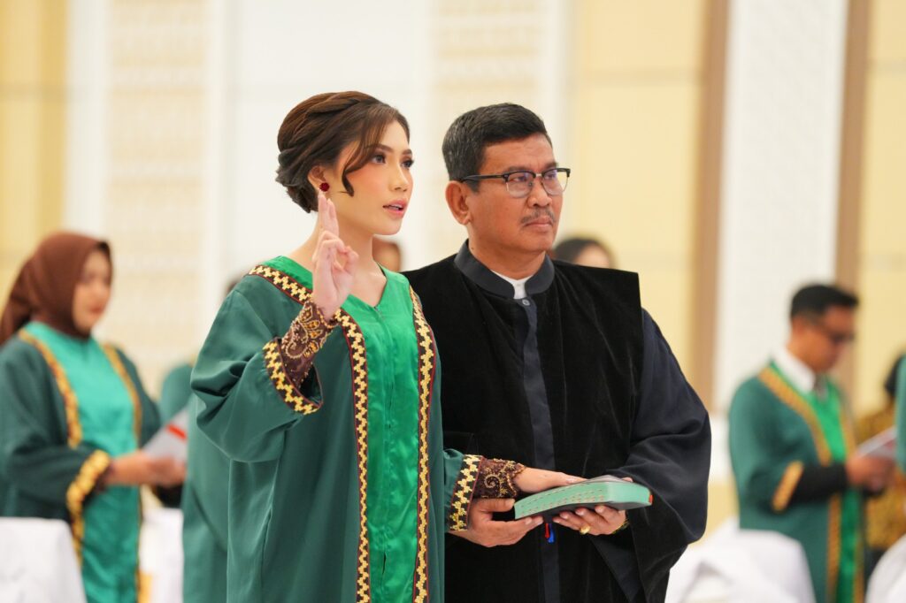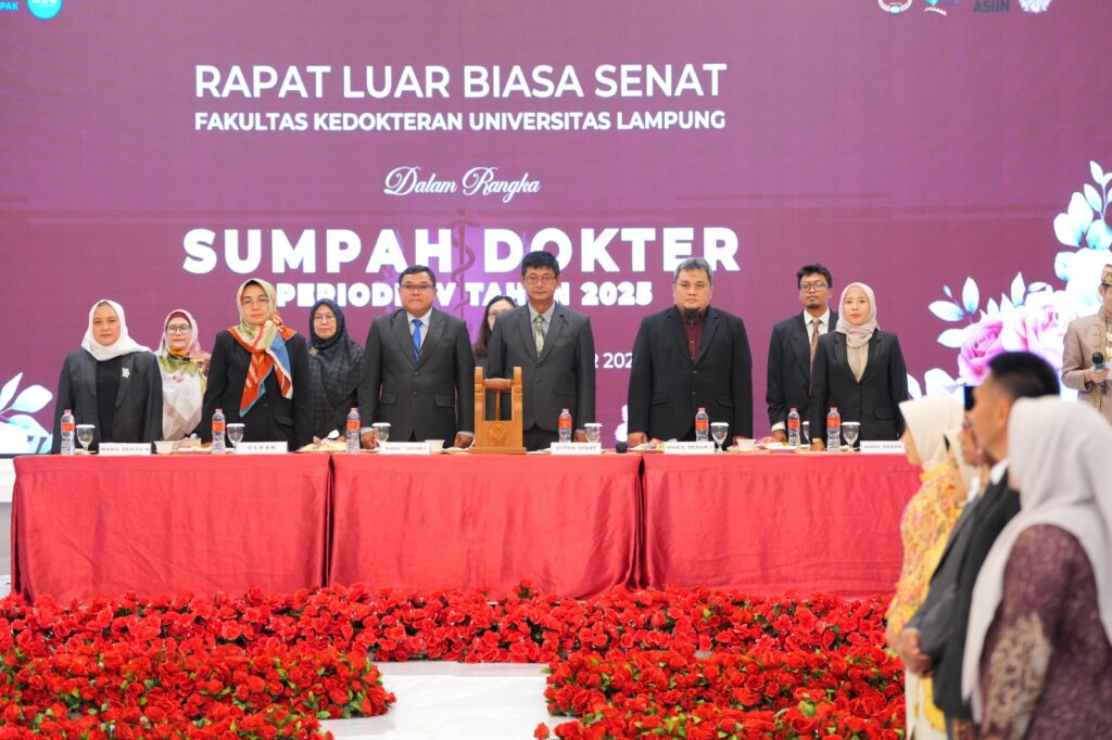 Para peserta dalam upacara tersebut secara resmi disahkan sebagai dokter. Pengambilan sumpah dipimpin Dekan FK Unila, Dr. dr. Evi Kurniawaty, S.Ked., M.Sc., didampingi rohaniwan dan disaksikan para pejabat serta keluarga lulusan.
