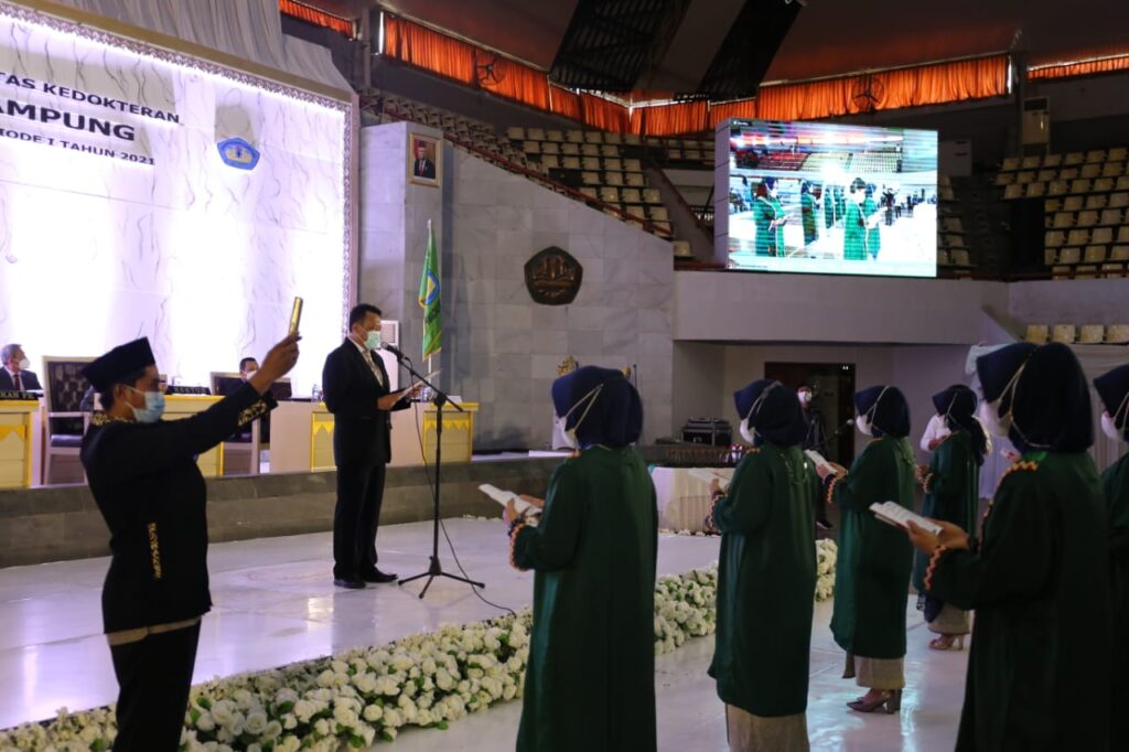 (Unila): 184 mahasiswa kedokteran Fakultas Kedokteran (FK) Universitas Lampung (Unila) melakukan Pengambilan Sumpah Program Profesi Dokter Periode I Tahun 2021, Rabu, 27 Januari 2021.