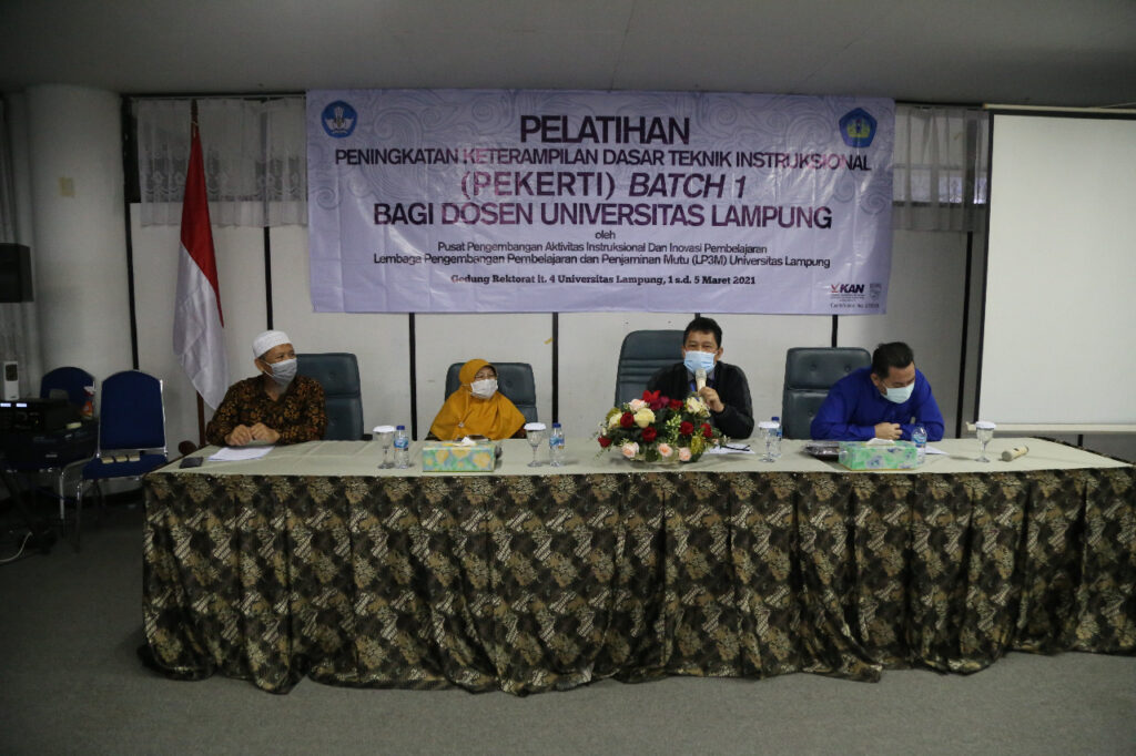 (Unila): 32 dosen muda Universitas Lampung (Unila) mengikuti Pelatihan Peningkatan Keterampilan Dasar Teknik Instruksional (Pekerti) yang diselenggarakan Lembaga Lembaga Pengembangan Pembelajaran dan Penjaminan Mutu (LP3M), Senin, 1 Maret 2021.