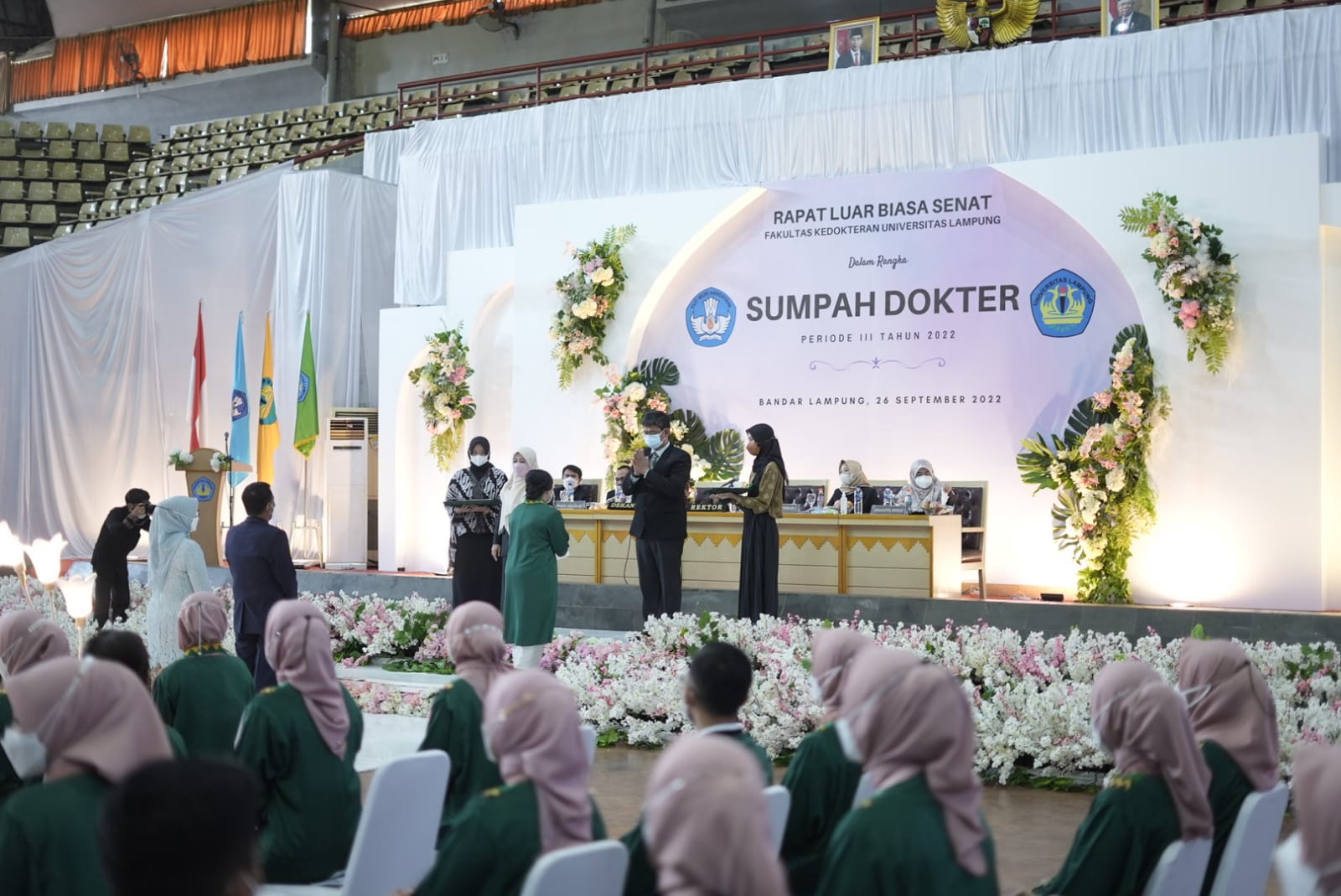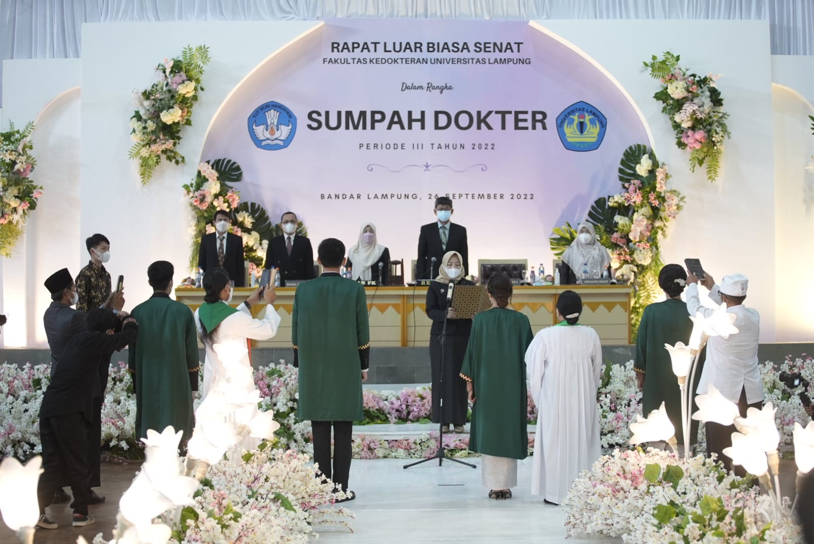 (Unila): 69 mahasiswa kedokteran Fakultas Kedokteran (FK) Universitas Lampung (Unila) mengkuti Pengambilan Sumpah Program Profesi Dokter Periode III Tahun 2022 di GSG kampus setempat, Senin, 26 September 2022.
