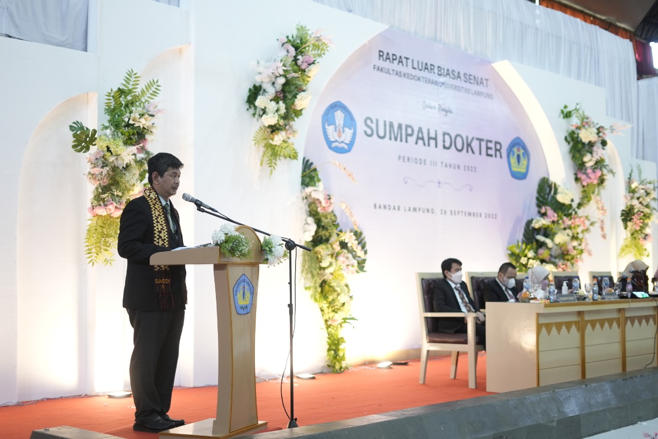 Dekan FK Unila Prof. Dr. Dyah Wulan Sumekar R.W., S.K.M., M.Kes., dalam sambutannya, menyampaikan selamat atas dilaksanakannya prosesi pengambilan sumpah dan pelantikan 69 dokter baru periode III tahun 2022.