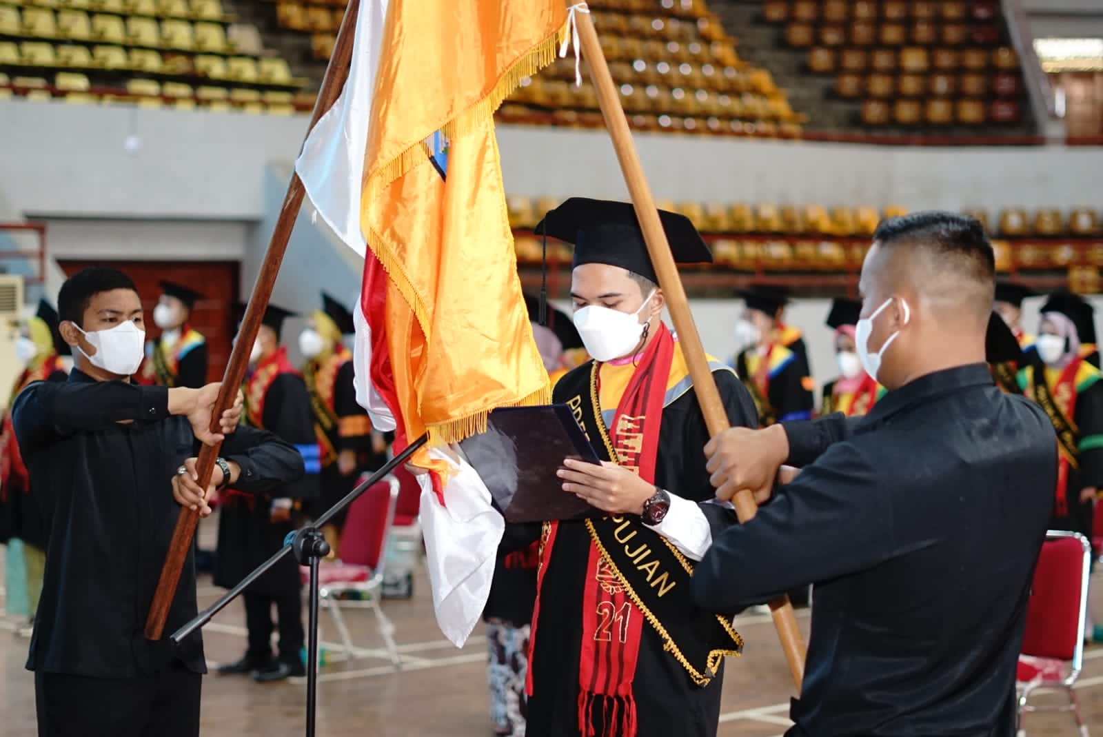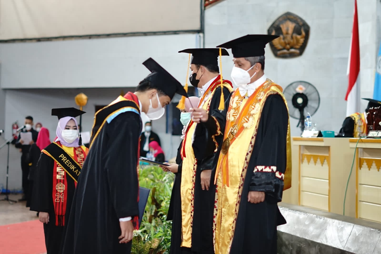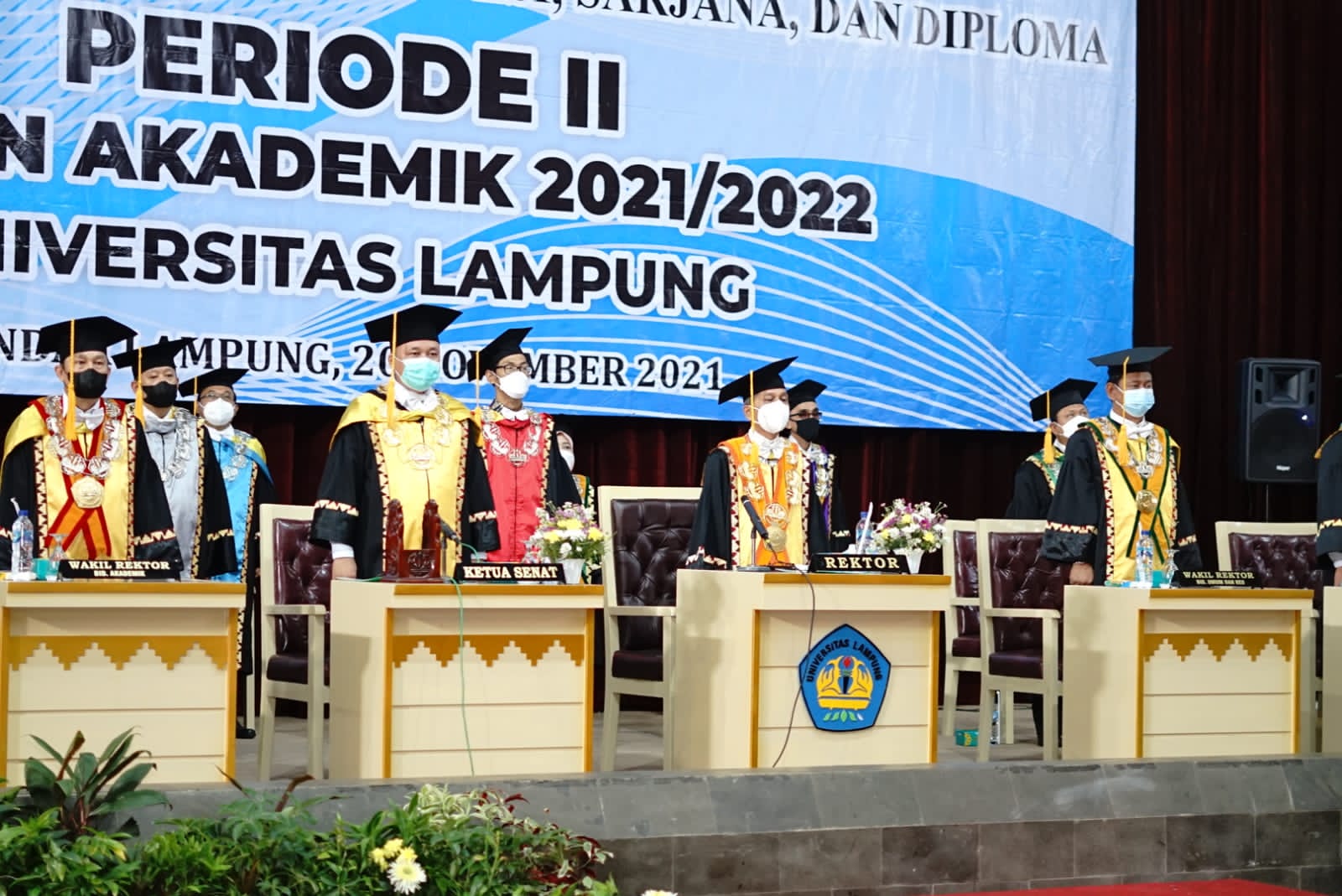 (Unila): 924 lulusan Universitas Lampung (Unila) mengikuti upacara wisuda daring Unila Periode II tahun akademik 2021/2022, Sabtu, 20 November 2021. Sejumlah perwakilan wisudawan mengikuti prosesi wisuda secara offline di GSG setempat.