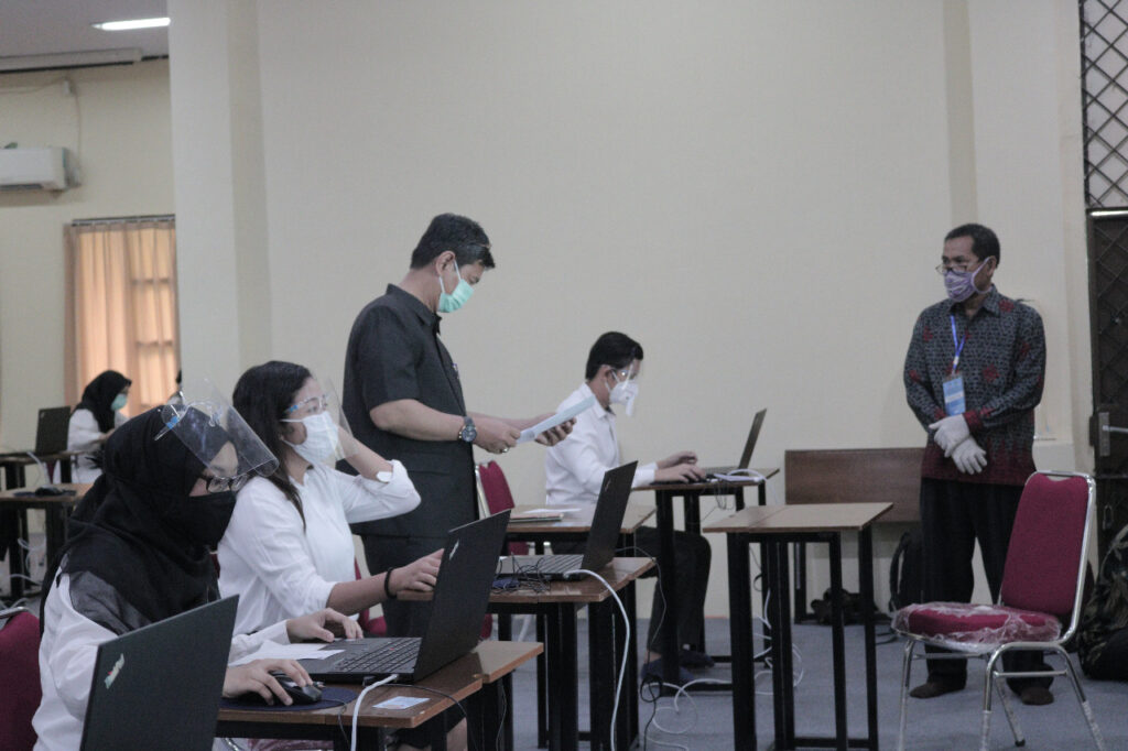(Unila): Wakil Rektor Bidang Umum dan Keuangan Universitas Lampung (Unila) Dr. dr. Asep Sukohar, M.Kes., memantau pelaksanaan Seleksi Kompetensi Bidang (SKB) Computer Based Test (CBT), Selasa (29/9/2020), di Gedung UPT TIK Unila.