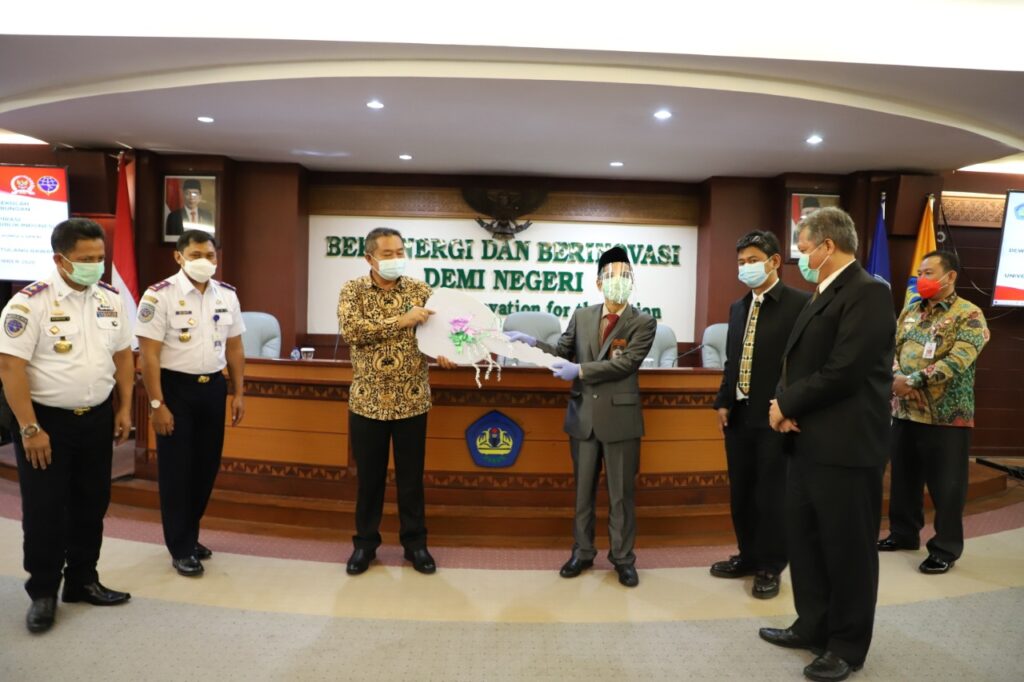 Bantuan diserahkan secara simbolis dari Anggota Komisi V DPR RI Bambang Suryadi, S.H., M.H., kepada Rektor Universitas Lampung Prof. Dr. Karomani, M.Si., di ruang sidang utama lantai 2 Rektorat Unila.