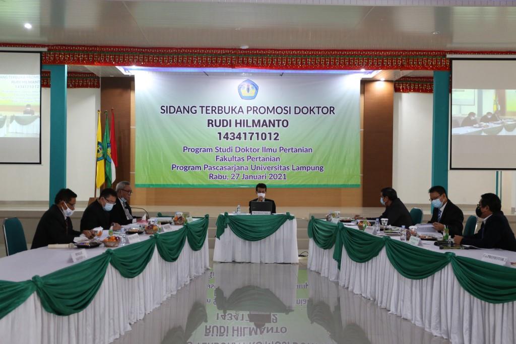 (Unila): Fakultas Pertanian (FP) Universitas Lampung (Unila) menggelar Sidang Terbuka Promosi Doktor Program Studi Doktor Ilmu Pertanian (PSDIP) Rudi Hilmanto. Kegiatan dilaksanakan dengan dua metode yakni secara tatap muka dan daring, di aula kampus setempat, Rabu, 27 Januari 2021.