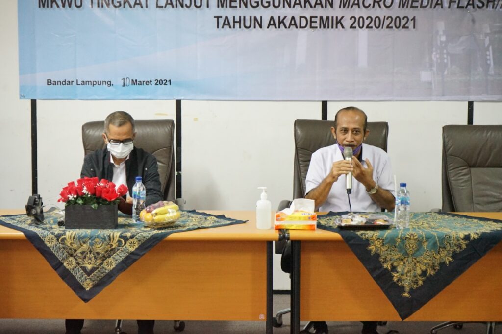 (Unila): Rektor Universitas Lampung (Unila) Prof. Dr. Karomani, M.Si., memberi sambutan pada kegiatan Workshop Pelatihan dan Pembuatan Media Pembelajaran MKU Tingkat Lanjut menggunakan Macro Media Flash/Authoware bagi Dosen Unila, Rabu 10 Maret 2021.