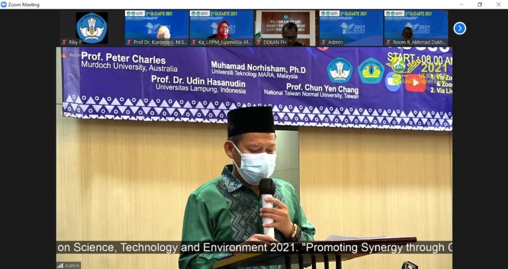 (Unila): Rektor Universitas Lampung (Unila) Prof. Dr. Karomani, M.Si., membuka acara The 2nd Universitas Lampung International Conference on Science, Technology, and Environment (ULICoSTE) 2021 pada Jumat pagi, 28 Agustus 2021.