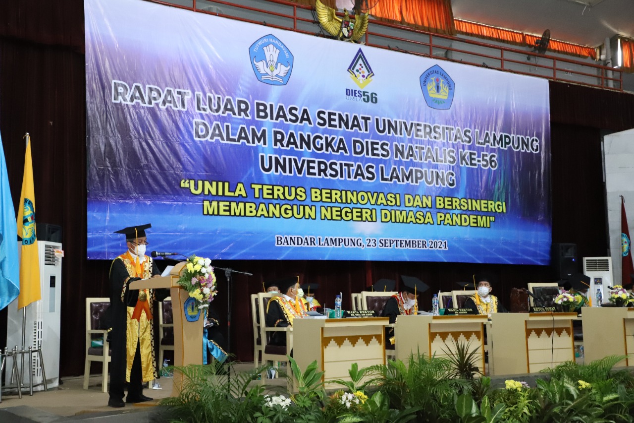“Peringatan Dies Natalis ke-56 ini akan termaktub dalam sejarah Unila. Mencatatkan sinergitas dan inovasi Unila yang derapnya tak terhenti, meski di tengah pandemi,” ujar Rektor Unila Prof. Dr. Karomani, M.Si., saat memberi sambutan pada Rapat Luar Biasa Senat dalam Rangka Dies Natalis ke-56 Unila di GSG setempat.