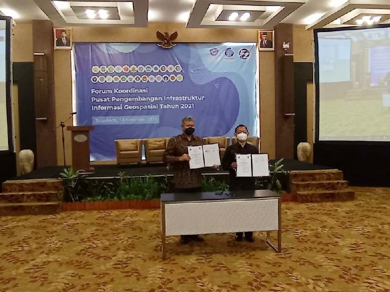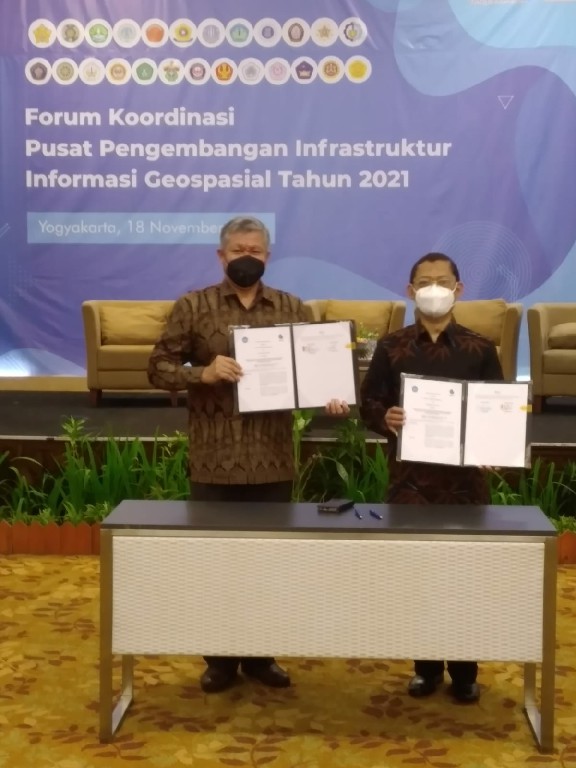 (Unila): Wakil Rektor Bidang PKTIK Universitas Lampung (Unila) Prof. Ir. Suharso, S.Si., Ph.D., ikut serta pada penandatanganan perjanjian kerja sama dengan Badan Informasi Geospasial (BIG) RI, di Eastparc Hotel Yogyakarta, Kamis, 18 November 2021.