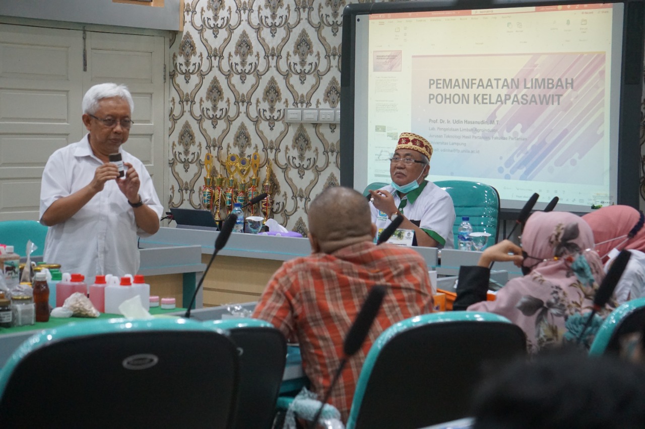 Prof. Dr. Ir. Udin Hasanudin, M.T., yang hadir sebagai narasumber dalam acara tersebut memaparkan Pemanfaatan Limbah Pohon Kelapa Sawit. Adapun poin materi meliputi program peremajaan sawit rakyat, potensi ekonomi batang sawit, batang sawit ditinggalkan di areal replanting, chipping batang sawit tua.