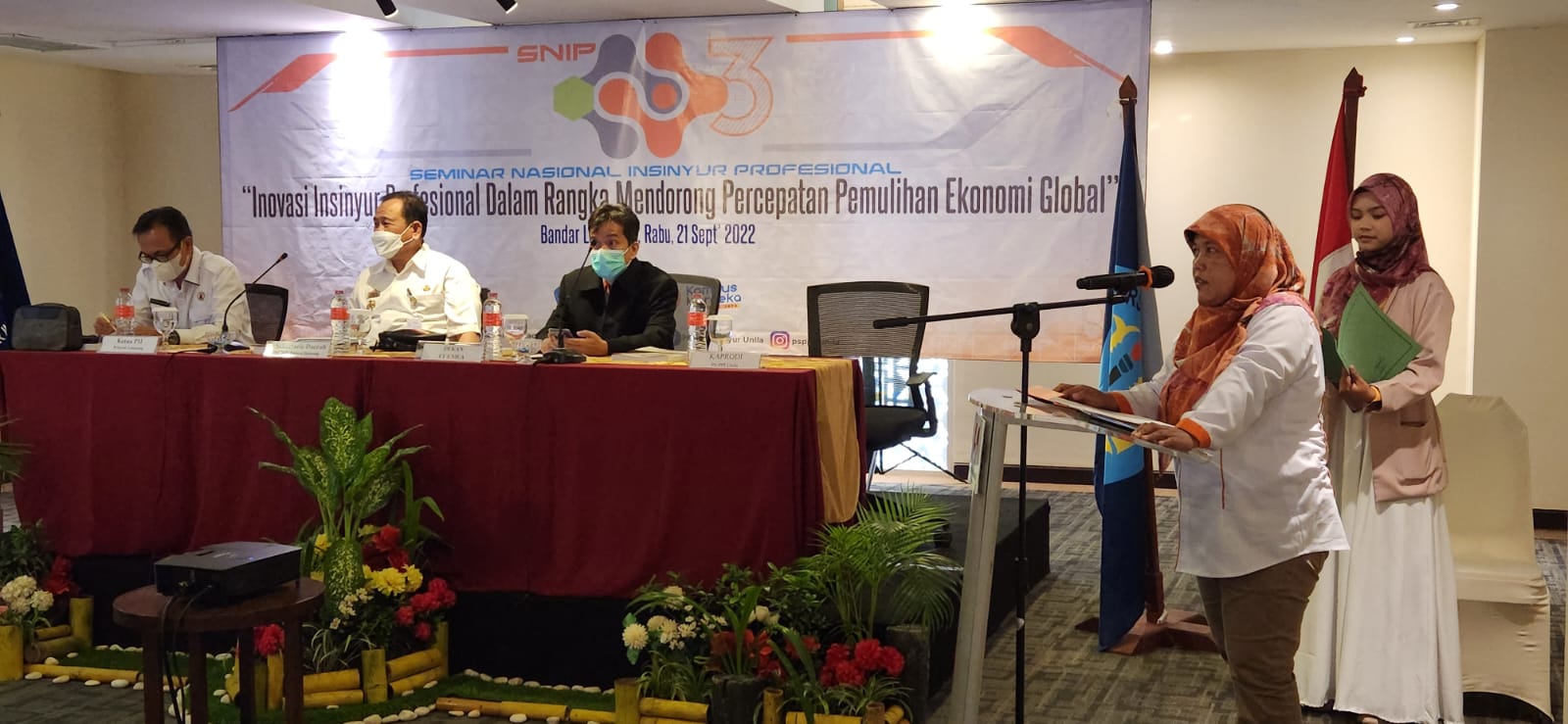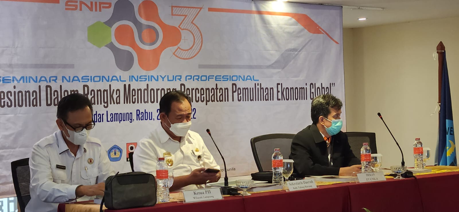 (Unila): Program Studi Program Profesi Insinyur (PSPPI) Fakultas Teknik (FT) Universitas Lampung (Unila) menggelar Seminar Nasional Insinyur Profesional (SNIP) 2022 secara hybrid di Hotel Swiss-Belhotel Lampung, Bandarlampung, Rabu, 21 September 2022.