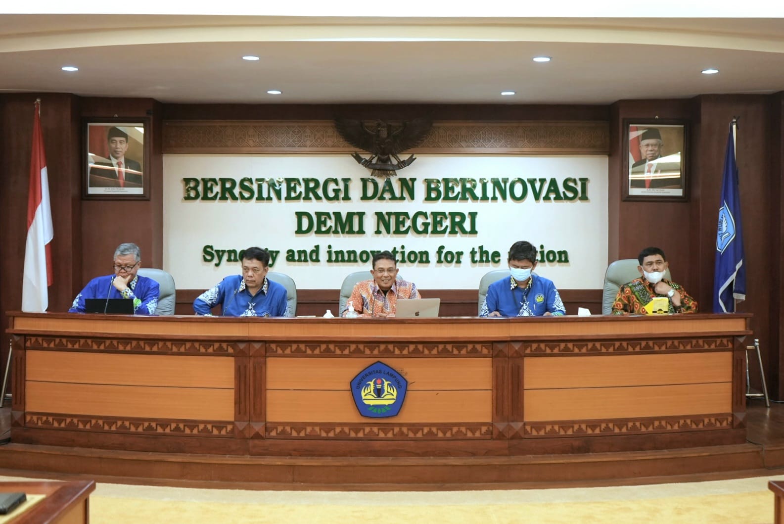 (Unila): Plt. Rektor Universitas Lampung (Unila) Dr. Mohammad Sofwan Effendi, M.Ed., memimpin rapat rutin pimpinan Universitas Lampung, Kamis, 3 November 2022. Kegiatan yang berlangsung di ruang sidang utama lantai dua Rektorat ini diikuti para wakil rektor, direktur pascasarjana, para dekan, para kepala biro, dan para ketua lembaga di lingkungan kampus setempat. []