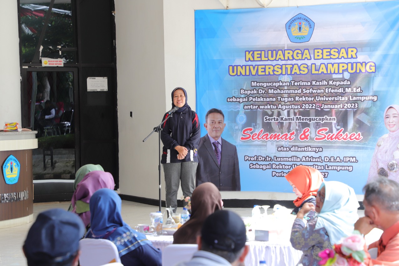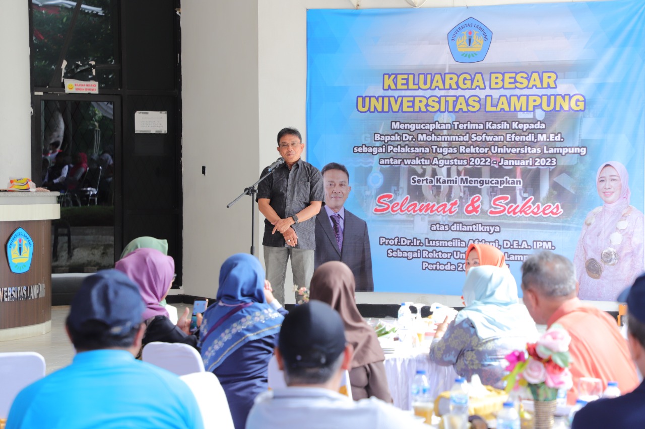 Saat sambutan, Prof. Lusmeilia menyampaikan terima kasih kepada Dr. Mohammad Sofwan Effendi, M.Ed., atas perhatiannya kepada Unila. “Saya mengucapkan terima kasih kepada Dr. Sofwan yang sudah menjadi Plt. di Universitas Lampung. Ini sebenarnya bukan perpisahan Pak, tapi merupakan penyelesaian tugas Plt. di Universitas Lampung,” ujarnya.