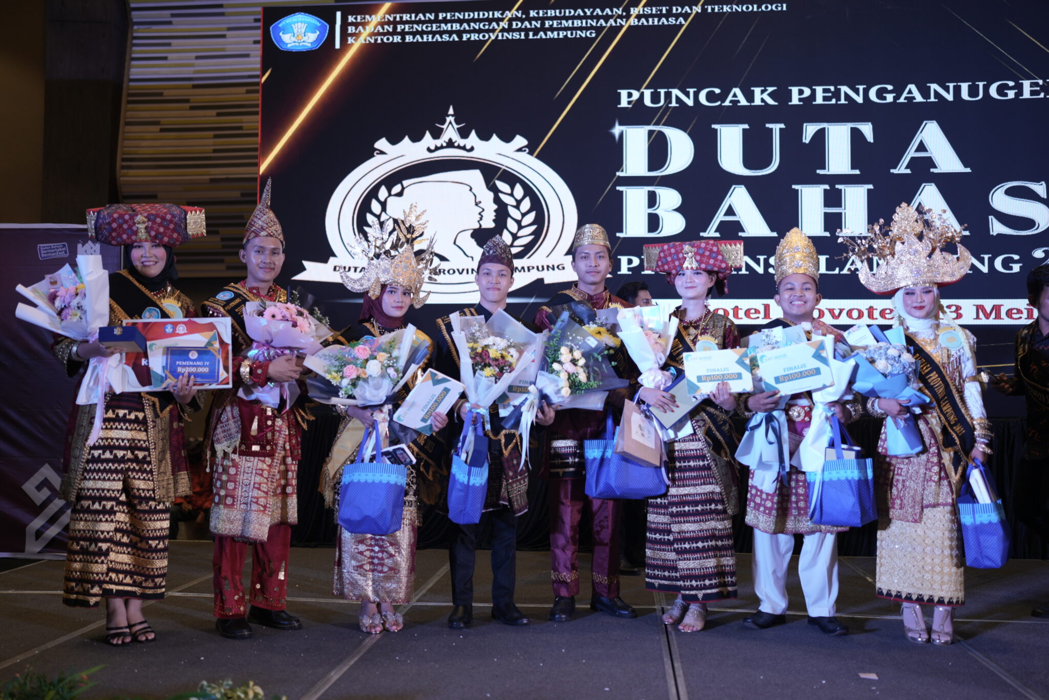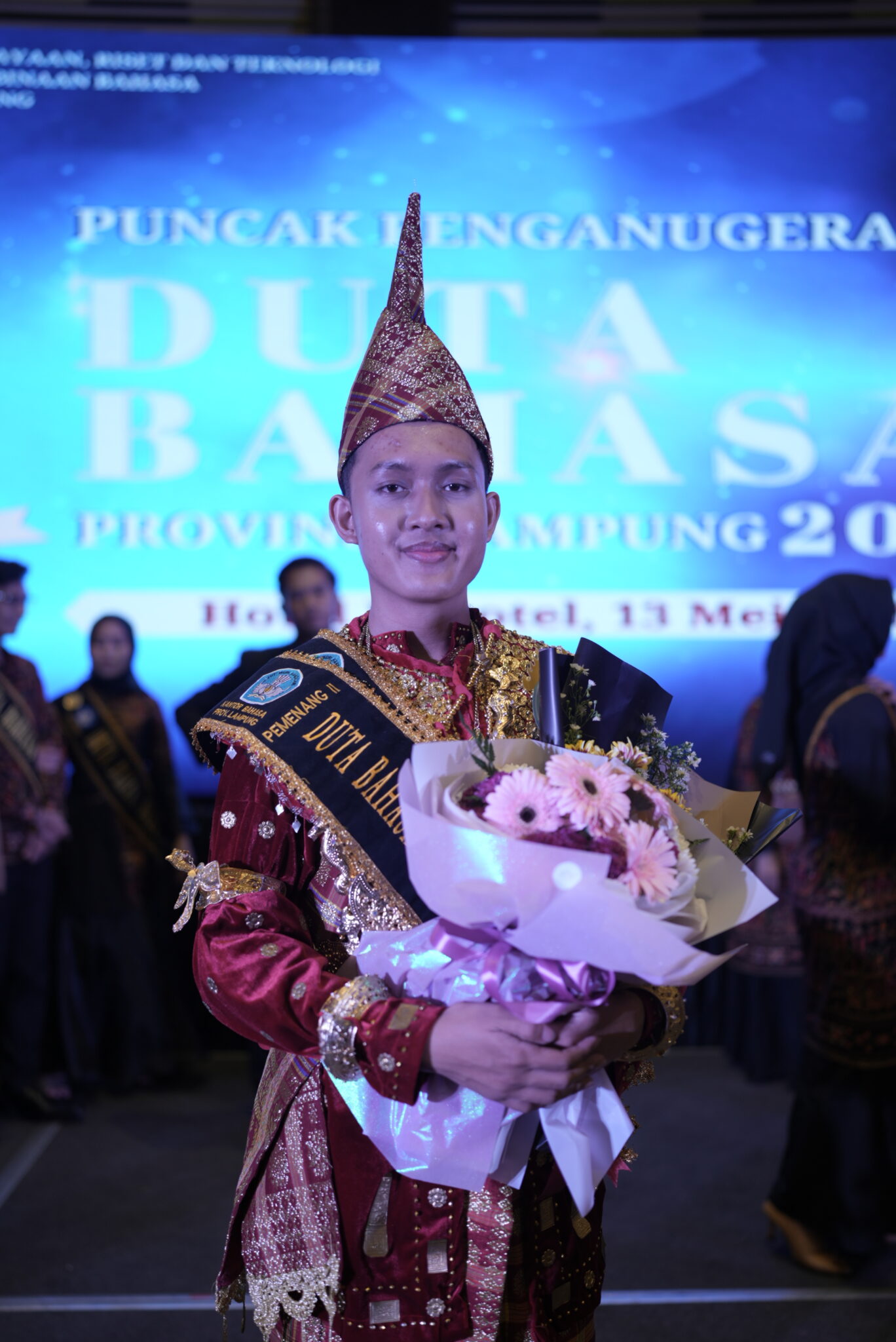 SUASANA sukacita terpancar pada sore hari di dalam Ballroom Hotel Novotel, Bandarlampung, Sabtu, 13 Mei 2023. Mengenakan busana merah marun ciri khas masyarakat adat Lampung Saibatin, Riza Faris Abqori berhasil menyandang gelar Juara II Duta Bahasa Provinsi Lampung 2023.