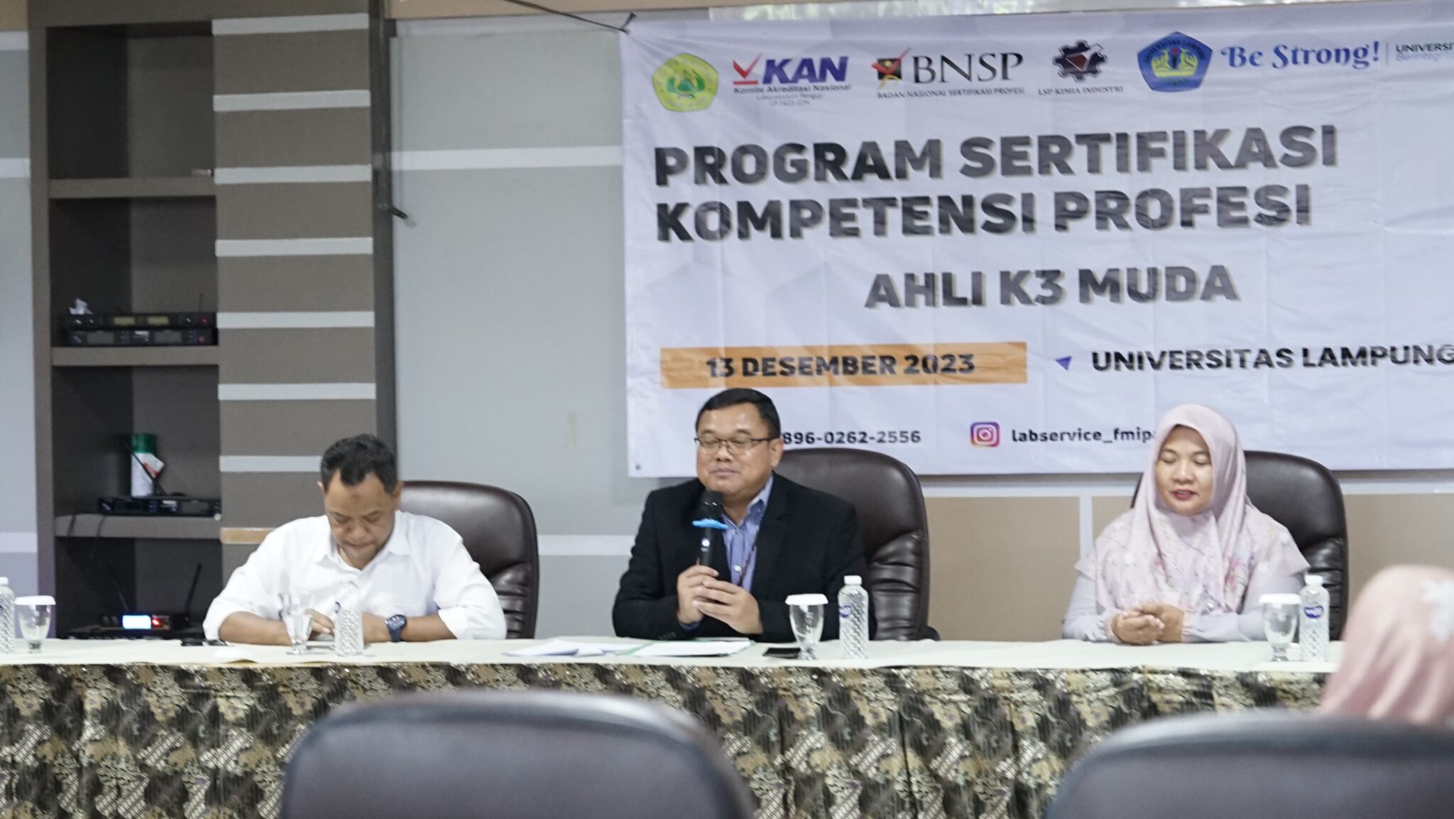 (Unila): Lembaga Pengembangan Pembelajaran dan Penjaminan Mutu (LP3M) Universitas Lampung (Unila) menggelar pelatihan sertifikasi kompetensi profesi ahli K-3 muda, pada Rabu, 13 Desember 2023, di ruang sidang satu lantai empat gedung rektorat setempat.