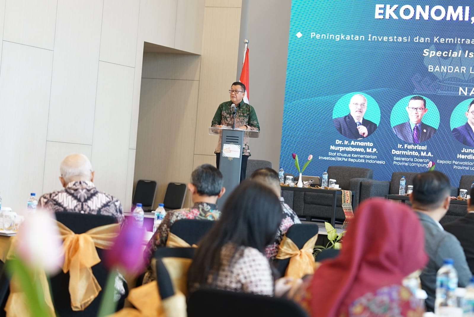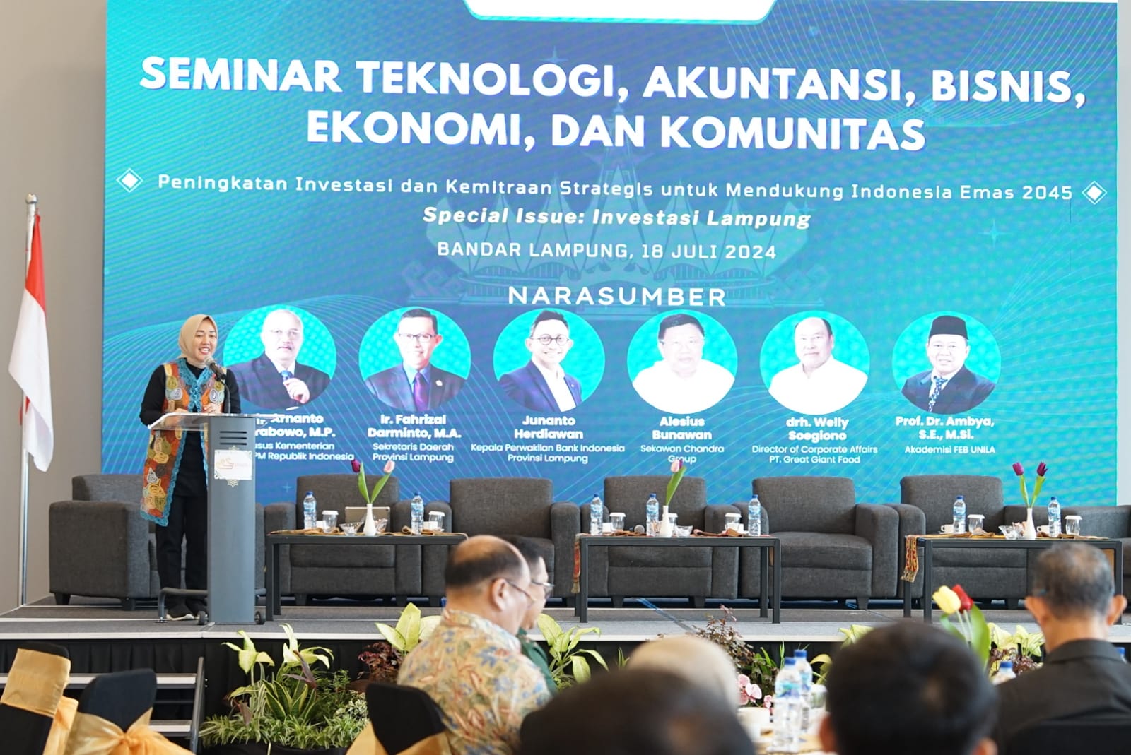 Seminar diikuti secara daring dan luring oleh peserta dari seluruh Indonesia dengan menghadirkan enam pembicara, yakni Staf Khusus Kementerian Investasi RI, Dr. Ir. Armanto Nurprabowo, M.P.; Sekdaprov Lampung, Ir. Fachrizal Darminto, M.A.; Kepala Perwakilan Bank Indonesia Provinsi Lampung, Junanto Herdiawan; Founder Sekawan Chandra Group, Alenius Bunawan; Direktur of Corporate Affairs PT. Great Giant Food, drh. Welly Soegiono; dan Guru Besar FEB Unila, Prof. Dr. Ambyar, S.E., M.Si.