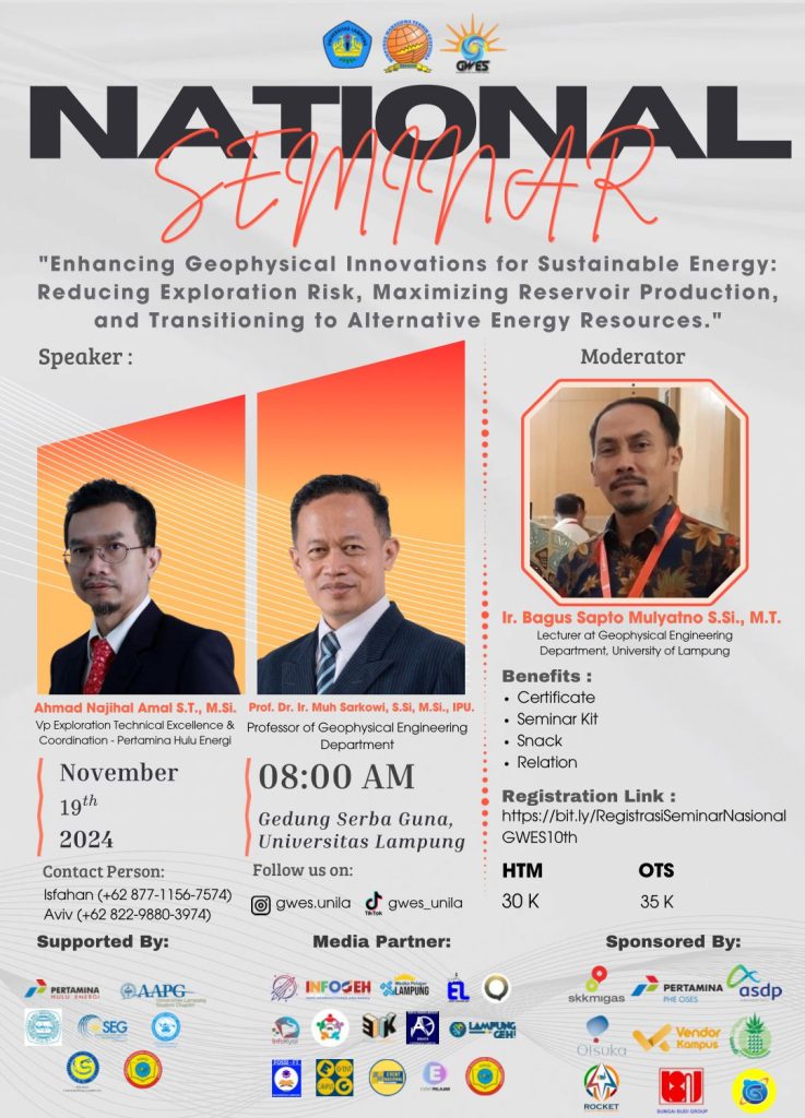 “Dalam maraknya transisi energi kita ke yang lebih bersih ini, kami dari Himpunan Mahasiswa Teknik Geofisika Lampung turut bangga dapat berkontribusi dalam memajukan inovasi-inovasi sustainable energy untuk bumi kita tercinta. Melalui seminar ini, kami berharap dapat membangun kolaborasi dan diskusi yang bermanfaat antara akademisi, praktisi, dan mahasiswa demi terwujudnya masa depan energi yang lebih berkelanjutan,” ujarnya.