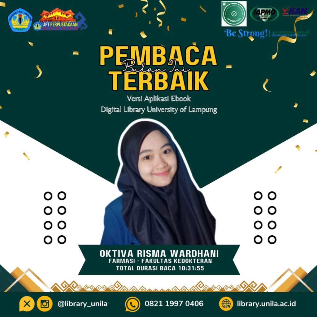 Pembaca Terbaik bulan November 2024 diraih Oktiva Risma Wardhani, mahasiswa Program Studi Farmasi Fakultas Kedokteran Unila. Oktiva mengungkapkan bahwa ia pertama kali mengenal aplikasi ini melalui laman library.unila.ac.id.
