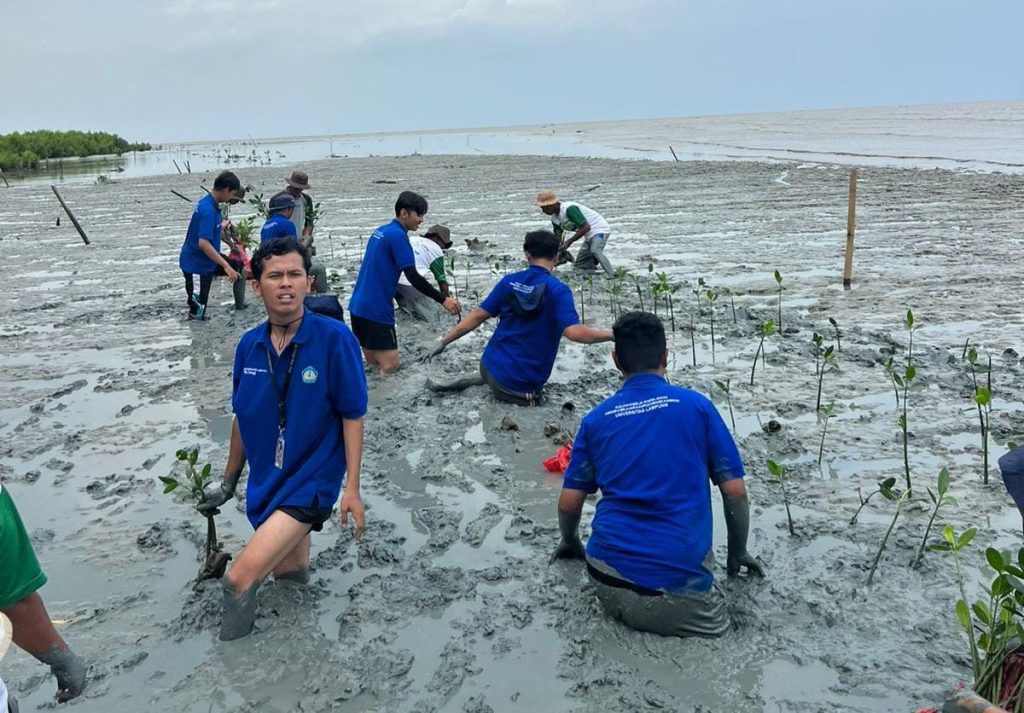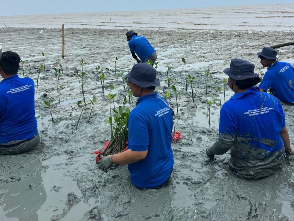 (Unila): Puluhan mahasiswa yang berada di wilayah Kecamatan Sragi Kabupaten Lampung Selatan bersama dengan pemerintah kecamatan dan pemerintah desa melakukan aksi penanaman Mangrove yang dimulai dari 08.00 sampai 17.00 wib sebagai wujud kepedulian terhadap bencana banjir yang sering terjadi di Desa Bandar Agung, Sabtu, 1 Februari 2025.