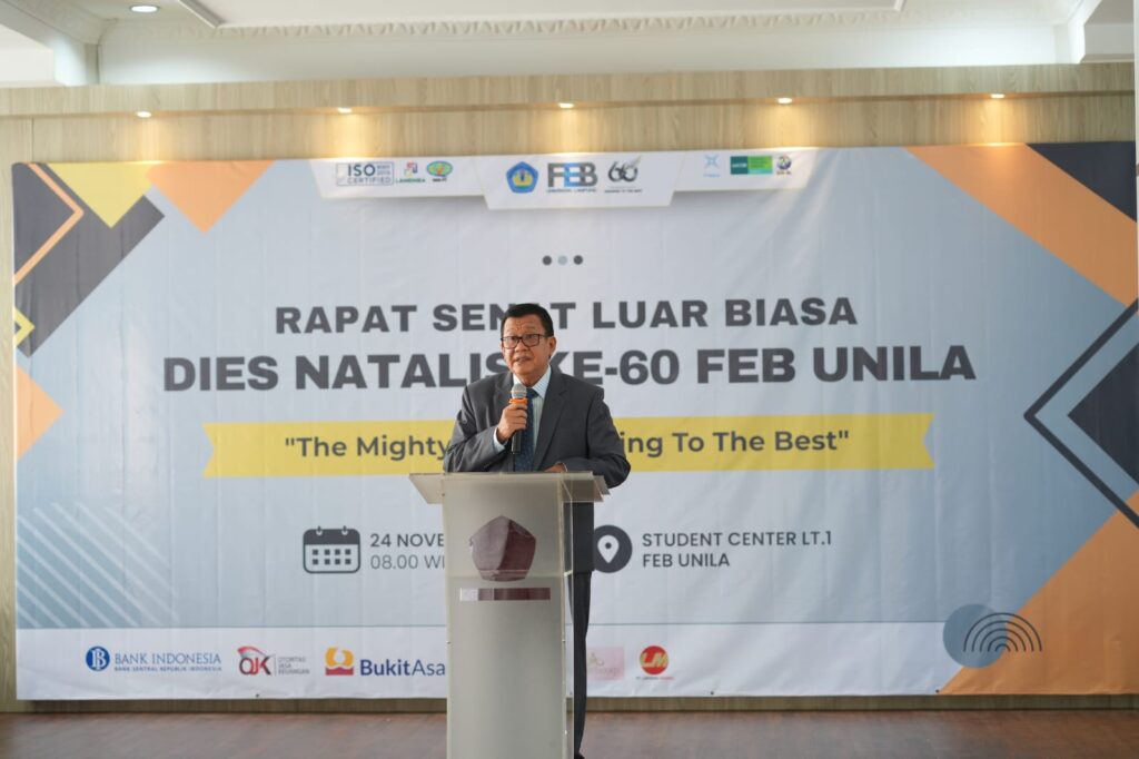 Dekan FEB Unila, Prof. Dr. Nairobi, S.E., M.Si., menyampaikan apresiasi atas dukungan seluruh pihak yang telah mengokohkan perjalanan panjang fakultas hingga mencapai usia ke-60.