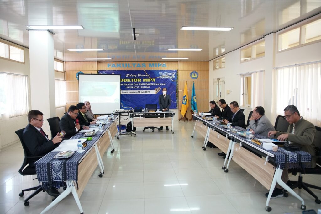 (Unila): Fakultas Matematika dan Ilmu Pengetahuan Alam (FMIPA) Universitas Lampung (Unila) kembali meluluskan doktor baru melalui ujian promosi doktor atas nama Bagus Sapto Mulyatno, pada Selasa, 22 Juli 2025. Kegiatan berlangsung di ruang sidang lantai tiga Gedung A FMIPA Unila.