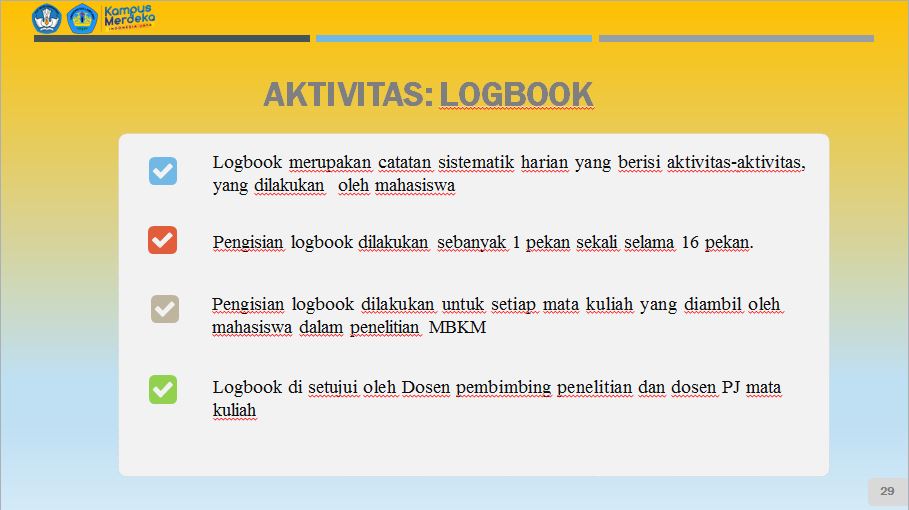 Bimtek dilaksanakan selama dua hari, dihadiri para mahasiswa yang lolos MBKM, ketua prodi, serta dosen PJ. Mahasiswa akan diminta untuk mengunggah learning agreement yang telah ditandatangani mahasiswa, dosen pembimbing akademik, ketua prodi, dan dekan. Selanjutnya, secara intens, mahasiswa akan mengunggah aktivitas mereka selama melaksanakan kegiatan MBKM.