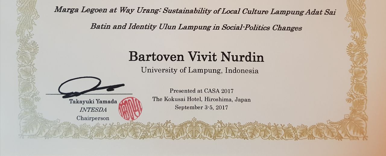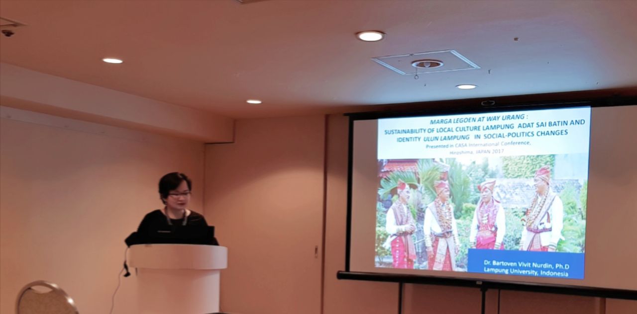 (Unila): Salah satu dosen terbaik FISIP Universitas Lampung Bartoven Vivit Nurdin, sukses mempresentasikan hasil penelitiannya bertajuk “Marga Legoen at Wayurang: Sustainability of Local Culture Lampung Adat Sai Batin and Identity Ulun Lampung in Social-Politics Change” pada ajang internasional Conference on Anthropology and Sustainability in Asia (CASA) 2017 di Hiroshima, Jepang, 3-5 September lalu.
