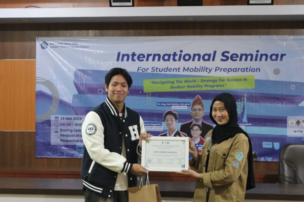 (Unila): Badan Eksekutif Mahasiswa (BEM) Fakultas Matematika dan Ilmu Pengetahuan Alam (FMIPA) Universitas Lampung (Unila) sukses menggelar seminar internasional persiapan mobilitas mahasiswa (International Seminar for Student Mobility Preparation) dengan mengambil tema “Navigating the World: Strategy for Success in Student Mobility Programs” pada Rabu, 28 April 2025, di ruang seminar lantai tiga UPT Perpustakaan Unila.