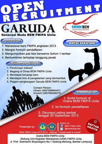 (Unila) : Badan Eksekutif Mahasiswa Fakultas Matematika dan Ilmu Pengetahuan Alam (BEM FMIPA) tengah menjaring mahasiswa baru (maba) 2013 untuk dijadikan Generasi Muda (Garuda) BEM FMIPA Unila.