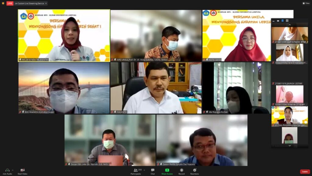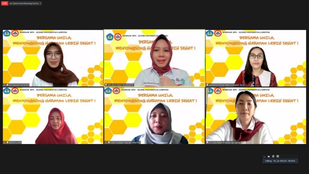 (Unila): Universitas Lampung (Unila) melalui Badan Pengelola (BP) Poliklinik Unila menyelenggarakan Webinar bertajuk “Bersama Unila Menyongsong Harapan Lebih Sehat”, Senin, 23 Agustus 2021.
