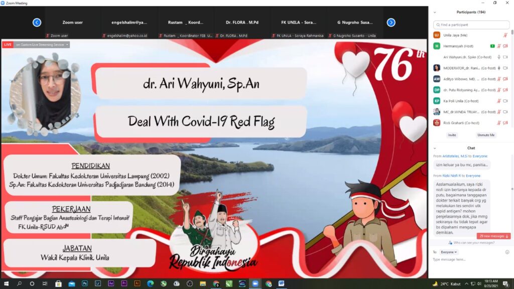 Kegiatan yang dilaksanakan daring via Zoom Meeting ini dihadiri jajaran pimpinan di lingkungan Unila, dosen, mahasiswa, tenaga kependidikan, dan para narasumber antara lain dr. Putu Risyaning Ayu Sangging, Sp., PK., M.Kes., dr. Adityo Wibowo, Sp., P., dan dr. Ari Wahyuni, Sp., An.