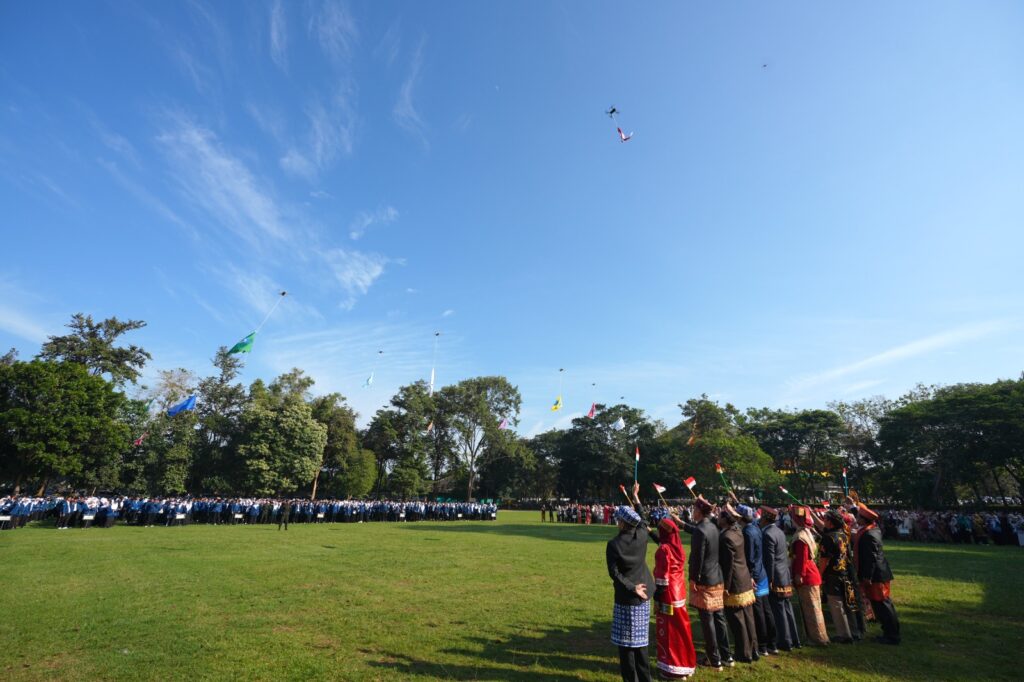 Ribuan sivitas akademika Unila hadir dan bersama-sama menyanyikan lagi Indonesia Raya sambil mengibarkan bendera Merah Putih dengan penuh khidmat dan kebanggaan.