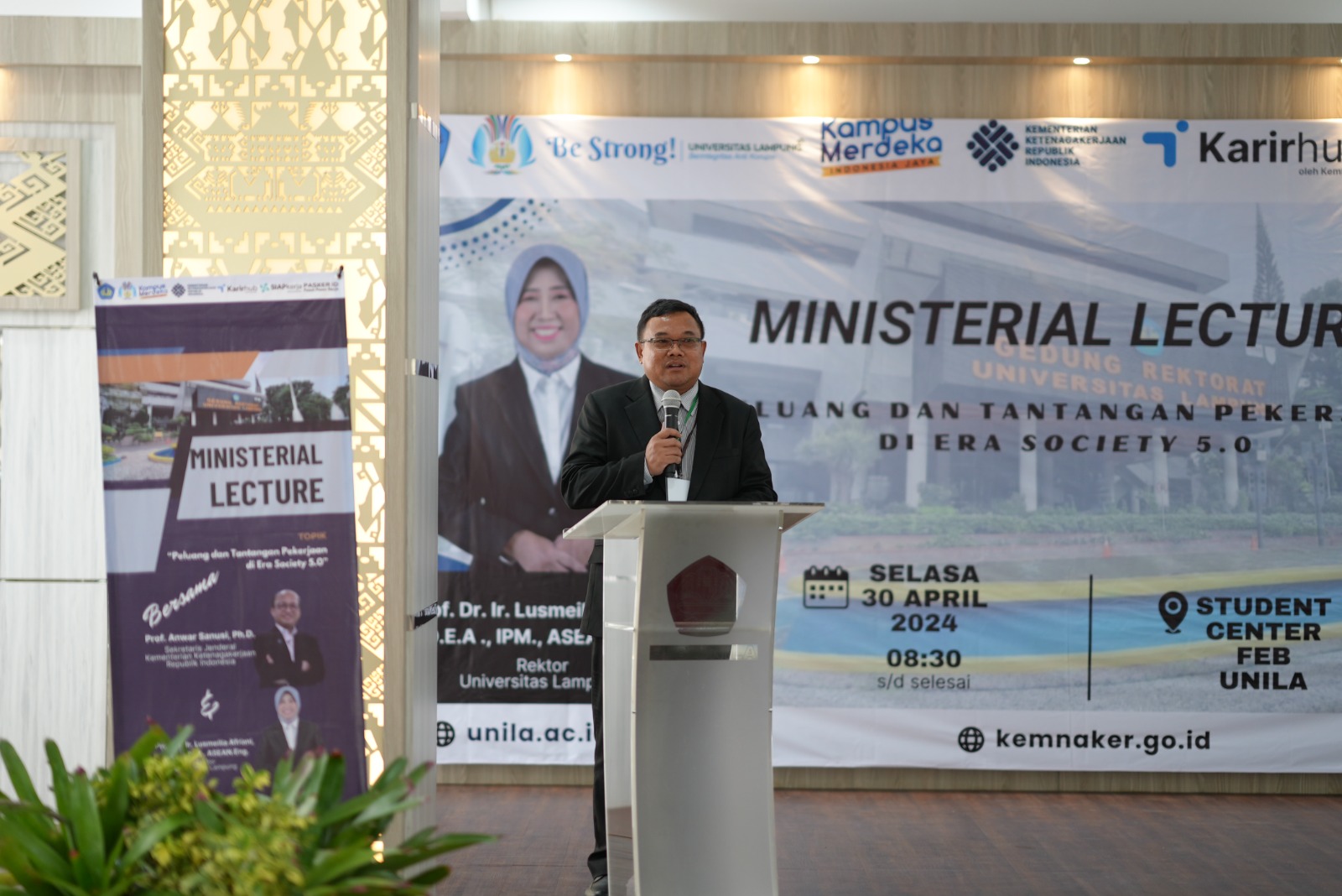 (Unila): Center for Career and Entrepreneurship Development (CCED) Universitas Lampung (Unila) menggelar ministerial lecture bersama Sekretaris Jenderal Kementerian Ketenagakerjaan Republik Indonesia Prof. Anwar Sanusi, Ph.D., Selasa, 30 April 2024.