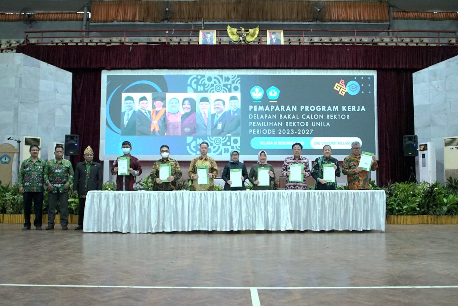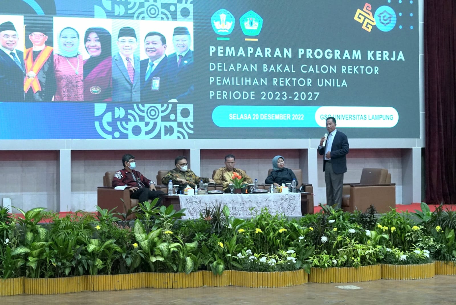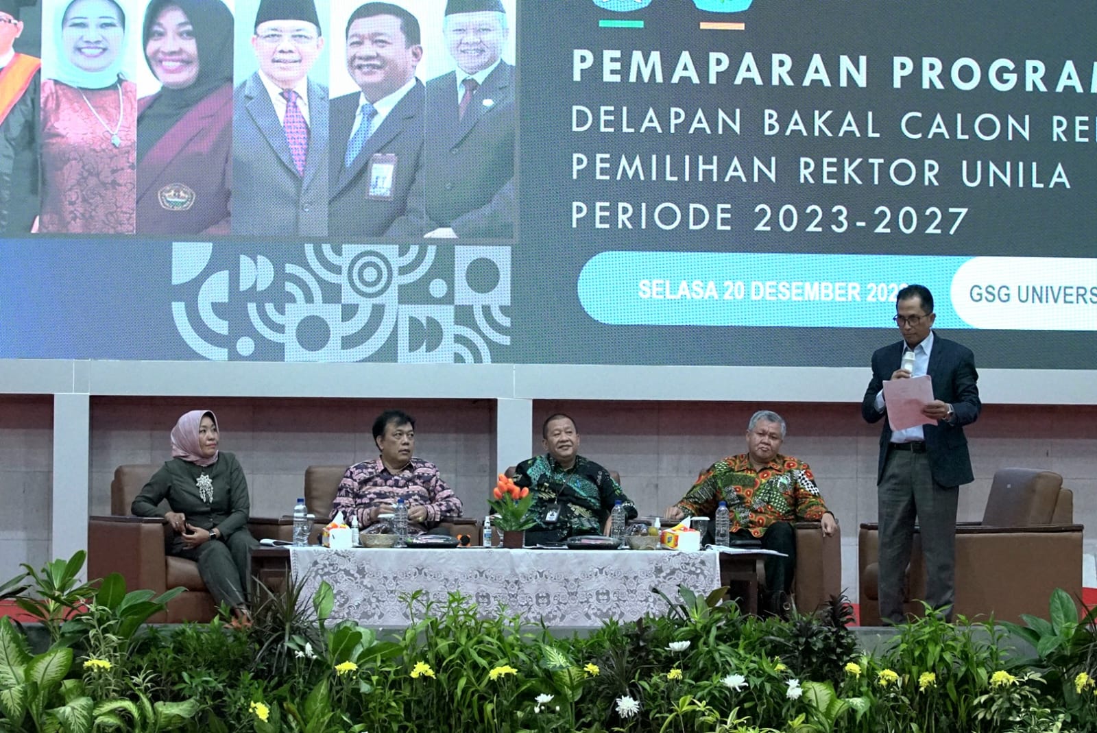 Dari hasil pendaftaran, kemudian ditetapkan melalui penjaringan oleh Senat Unila, delapan Bakal Calon Rektor periode 2023 – 2027. Penyampaian visi, misi, dan program kerja, dibagi menjadi dua sesi yang dihadiri anggota Senat Unila, dosen, tenaga kependidikan, serta para stakeholders.