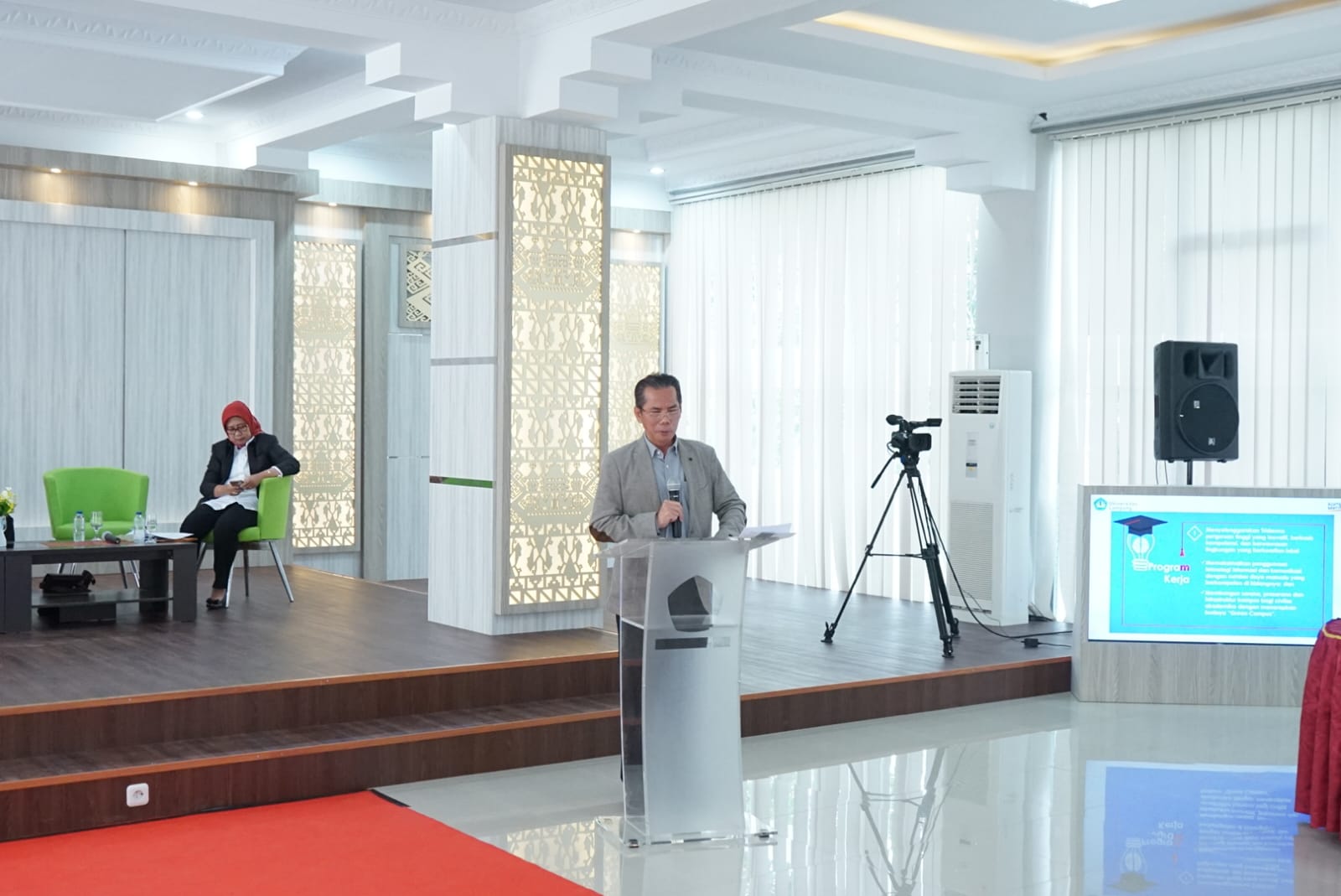 Bakal calon Rektor Unila Prof. Asep Sukohar mendapat kesempatan pertama menyampaikan paparan. Ia mengatakan ingin mentransformasi ekosistem unggul Unila yang bermartabat, berdaya saing melalui kolaborasi dan inovasi menuju Indonesia emas 2045.