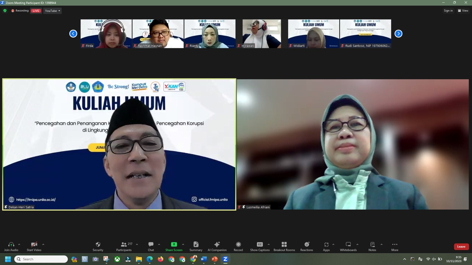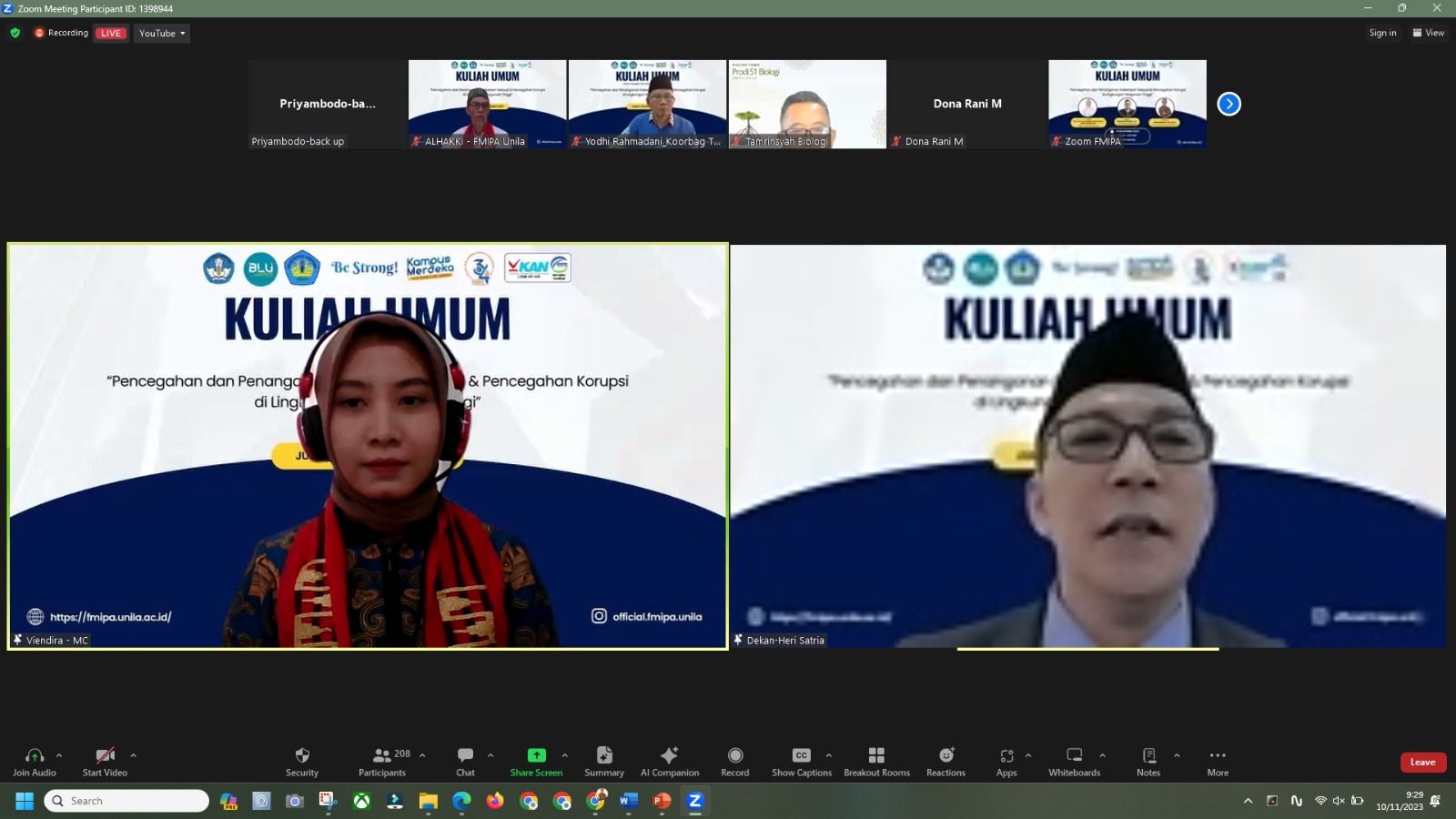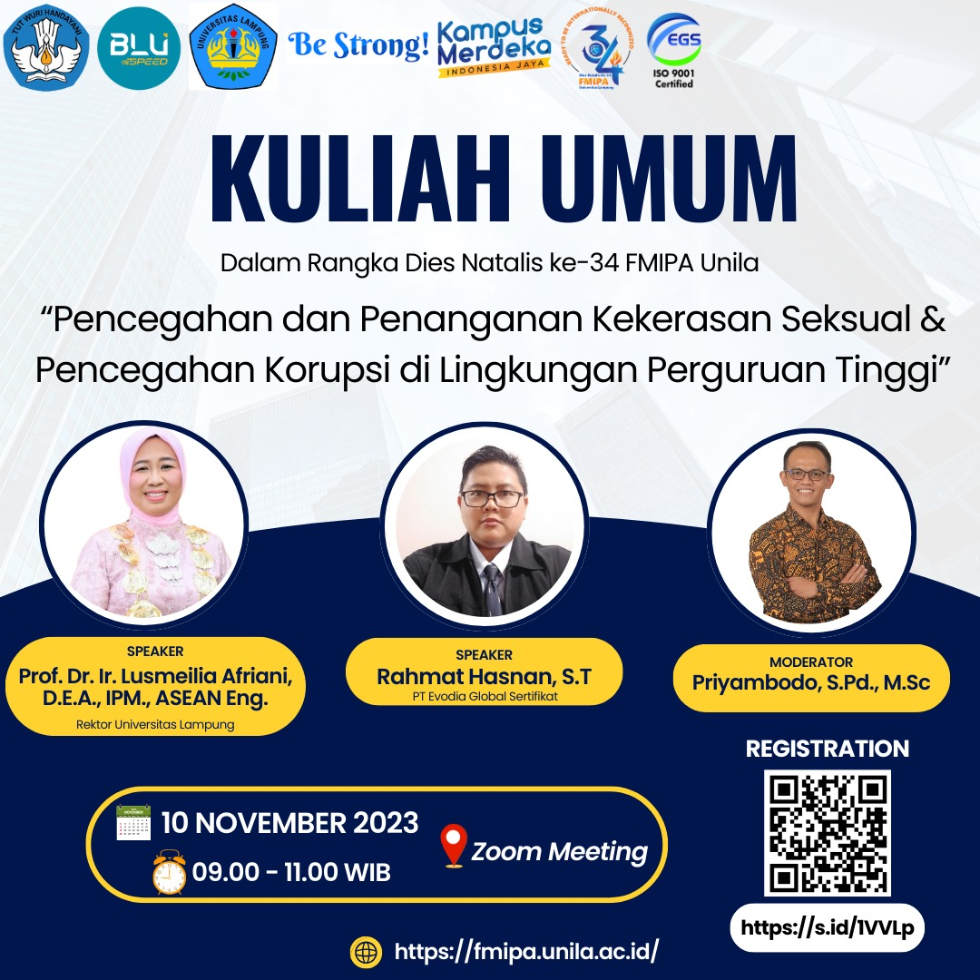 (Unila): Dalam rangkaian dies natalis yang ke-34, Fakultas Matematika dan Ilmu Pengetahuan Alam (FMIPA) Universitas Lampung (Unila) menggelar kuliah umum online pada Jumat, 10 November 2023.