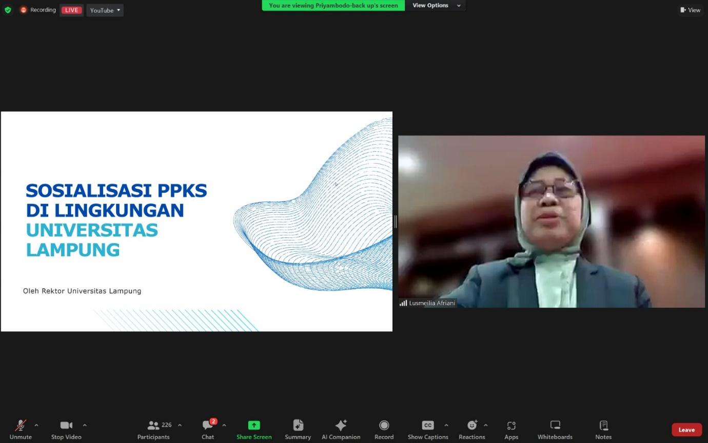 Prof. Lusmeilia menekankan, Unila telah membentuk tim khusus untuk menjalankan PPKS, dengan fokus pada pendampingan, perlindungan, sanksi administratif, dan pemulihan korban.