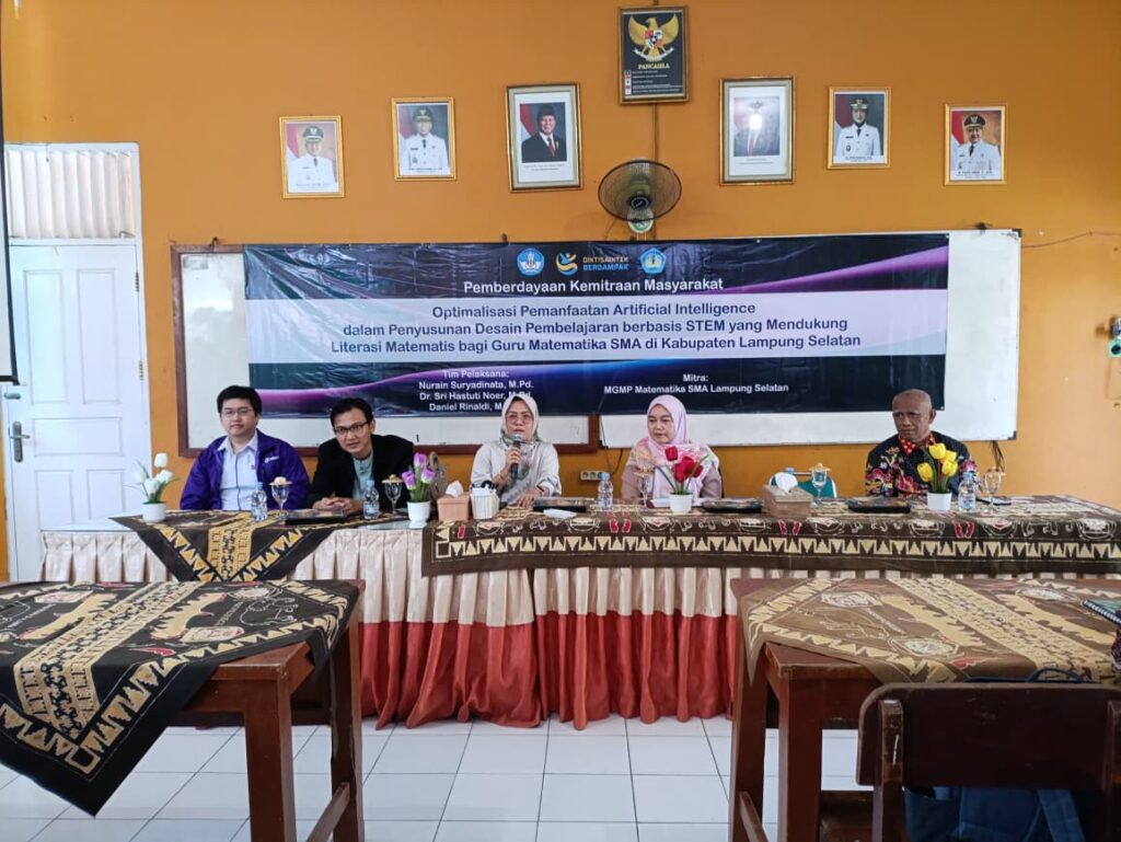 (Unila): Tim dosen dan mahasiswa Fakultas Keguruan dan Ilmu Pendidikan (FKIP) Universitas Lampung (Unila) menggelar pelatihan bertajuk “Optimalisasi Pemanfaatan AI dalam Penyusunan Desain Pembelajaran Berbasis STEM yang Mendukung Literasi Matematis bagi Guru Matematika di Kabupaten Lampung Selatan”.