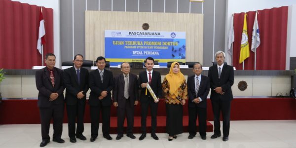 Ryzal took the Open Examination for Doctoral Promotion in the Postgraduate Program at the Faculty of Education of UNS on Wednesday (01/08/2020). The exam took place in the Meeting Room of Postgraduate II UNS. After the exam, the examiner declared that Ryzal had attained satisfactory results. Then, his name was listed as the youngest doctor from Lampung Province.