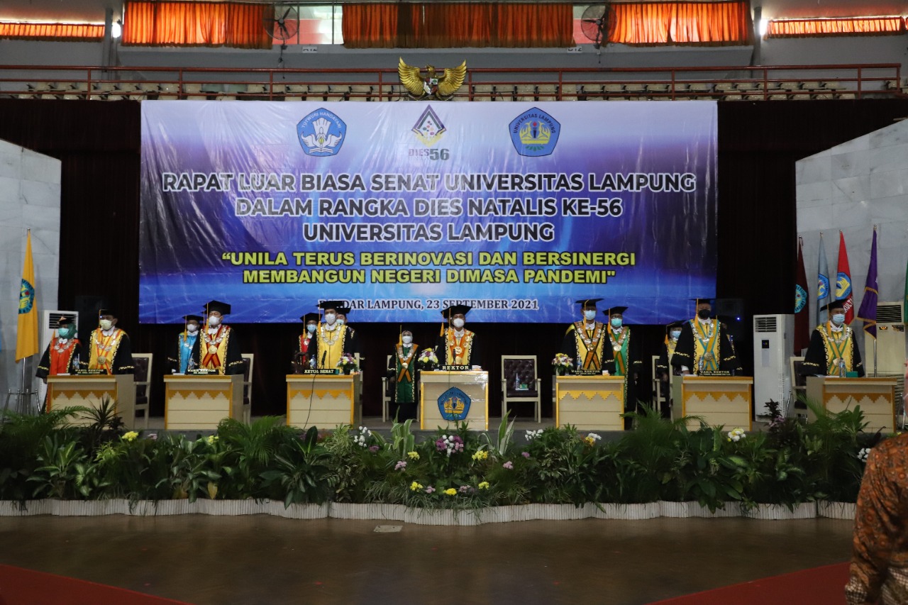 “The 56th Dies Natalis will go down in Unila’s history. “Recording Unila’s synergy and innovation, which have continued unabated, even in the face of a pandemic,” Prof. Karomani stated during a speech at the extraordinary senate meeting for the 56th anniversary of Unila at the local GSG.