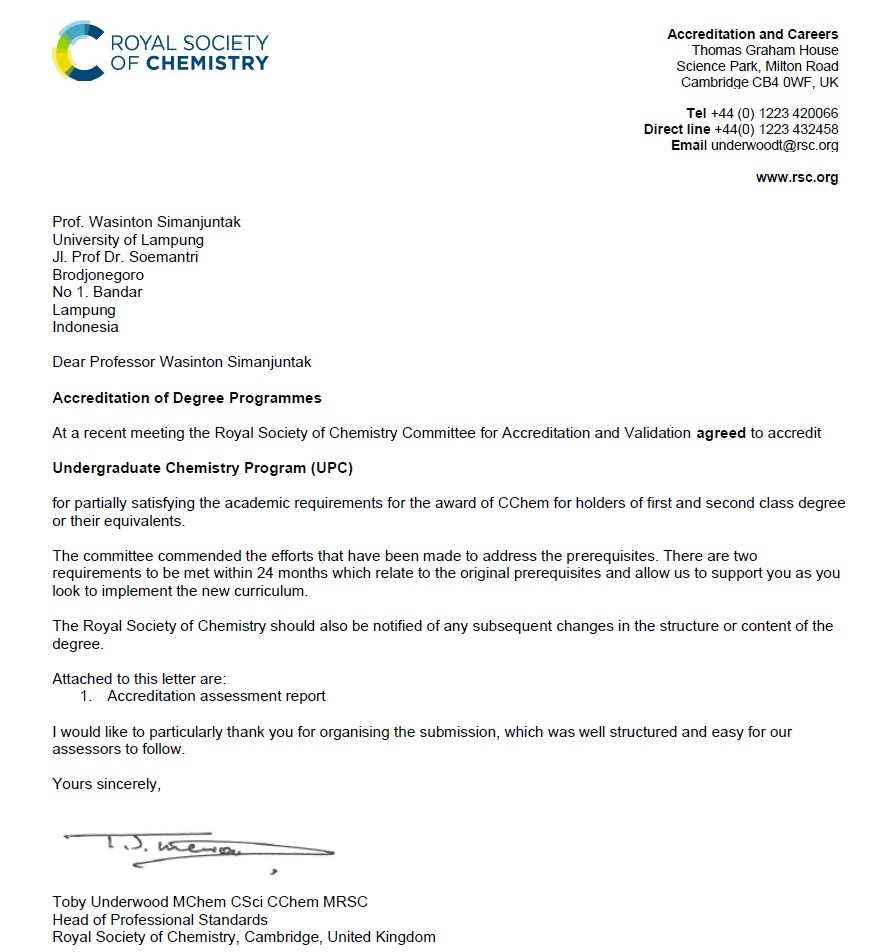 (Unila): The Chemistry Study Program at the University of Lampung’s (Unila) Faculty of Mathematics and Natural Sciences (FMIPA) has received worldwide accreditation from the Royal Society of Chemistry (RSC).