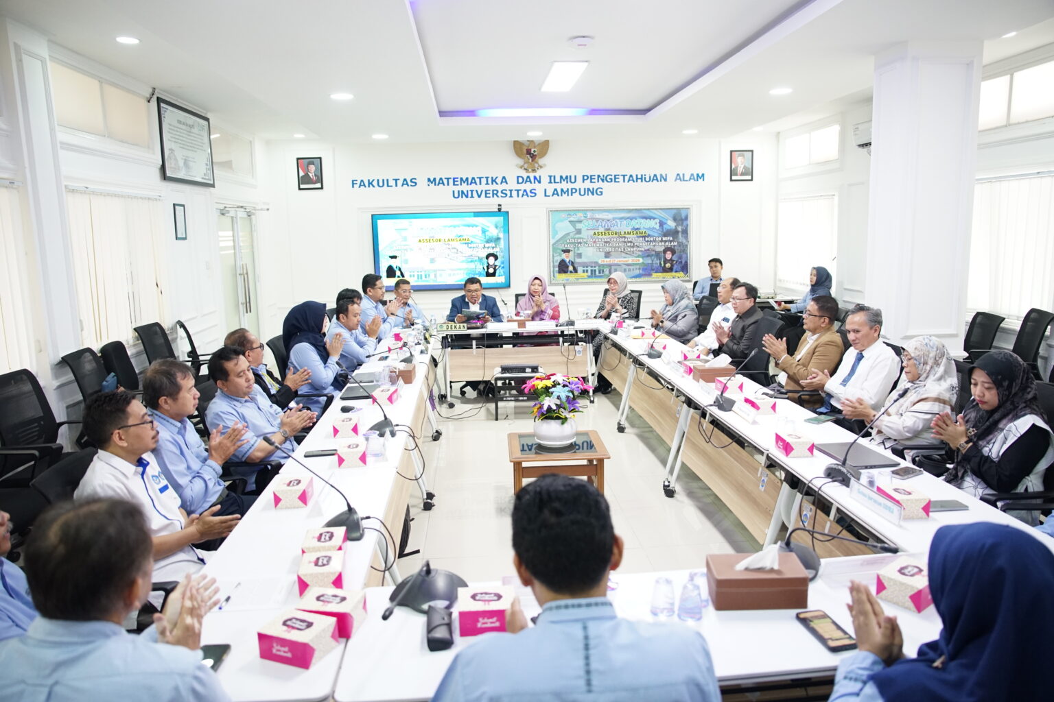 (Unila): The University of Lampung (Unila) conducted a Field Assessment (AL) for the Lamsama Accreditation of the MIPA Doctoral Study Program, on Monday, January 26, 2026, on the second floor courtroom of the Dean’s Building of the Faculty of Mathematics and Natural Sciences (FMIPA) on the local campus.