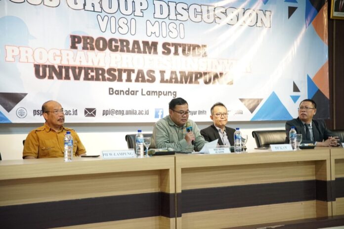 (Unila): The University of Lampung (Unila) held a focus group discussion (FGD) on the strategic plan (renstra), vision-mission, and curriculum development of the Engineering Professional Program (PSPPI), on Tuesday, January 27, 2026, in the second floor meeting room, Dean’s Office of the Faculty of Engineering (FT) on the local campus.