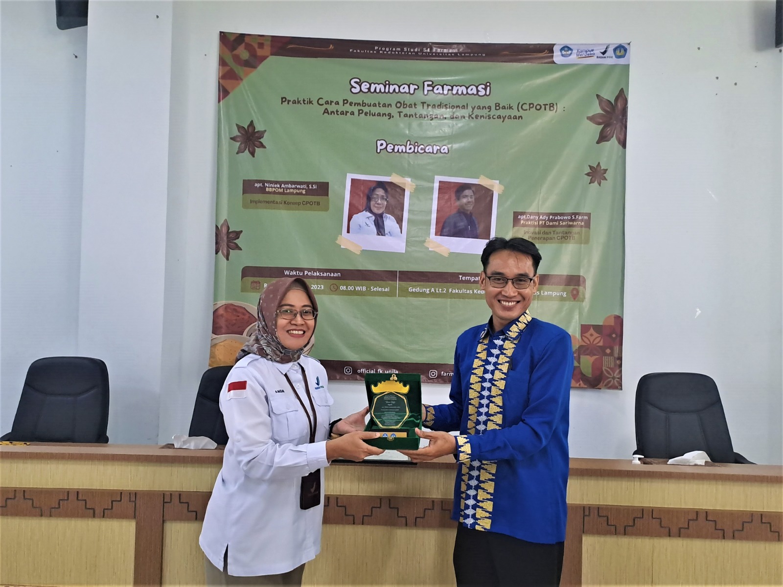 (Unila): Program Studi S1 Farmasi Jurusan Farmasi Fakultas Kedokteran Universitas Lampung menggelar Seminar Farmasi bertema “Cara Pembuatan Obat Tradisional yang Baik (CPOTB): Antara Peluang, Tantangan dan Keniscayaan”, Rabu, 23 Agustus 2023 di Gedung A Lantai 2 FK Unila.