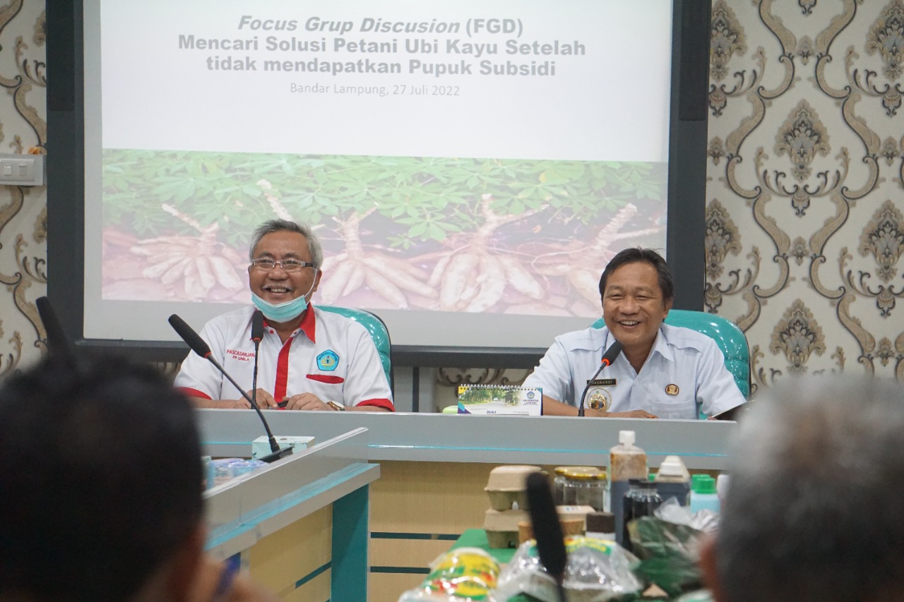 Topik besar pembahasan FGD yang diselenggarakan di Ruang Sidang Dekanat Fakultas Pertanian (FP) Universitas Lampung (Unila), Rabu, 27 Juli 2022, yaitu mencari solusi bagi para petani ubi kayu setelah tidak lagi mendapat pupuk bersubsidi.