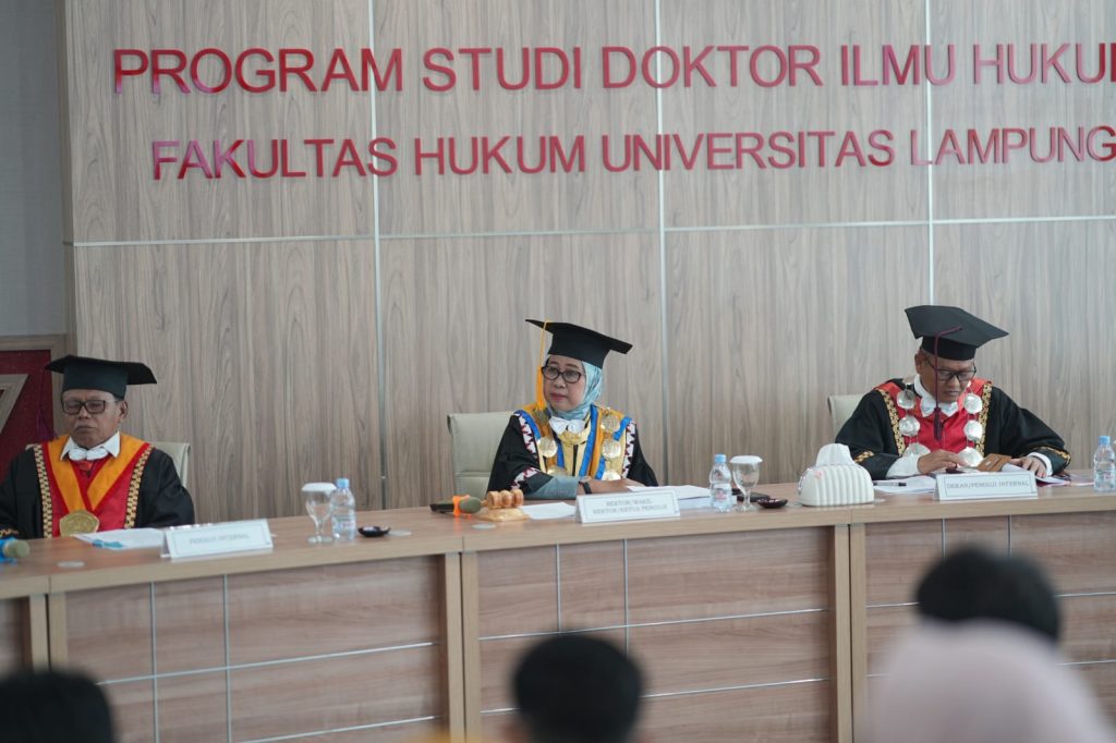 Sidang dibuka Rektor Unila Prof. Dr. Ir. Lusmeilia Afriani, D.E.A., IPM., ASEAN., Eng., yang bertindak sebagai Ketua Penguji. Serta sejumlah penguji, antara lain Penguji Eksternal Dr. Saut Panjaitan, S.H., M.Hum., Penguji Internal Prof. Dr. HS. Tisnanta, S.H., M.H., Dr. Budiyono, S.H., M.H., dan Dr. Muhtadi, S.H., M.H.