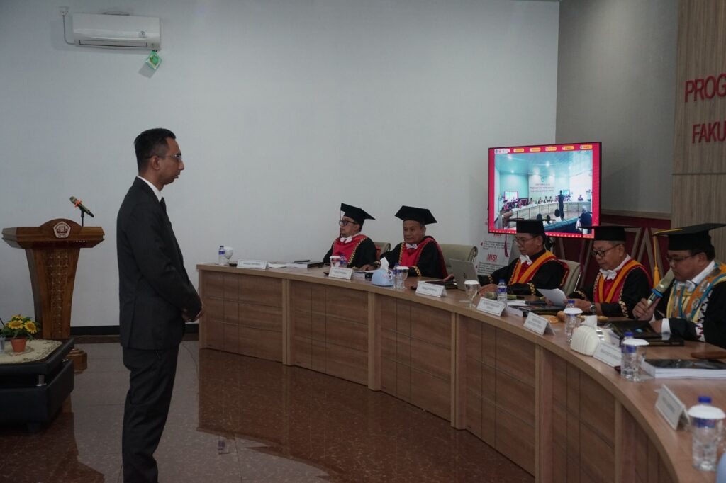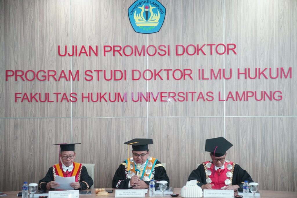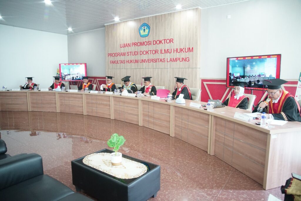 Kegiatan berlangsung di Gedung B lantai dua Program Studi Doktor Ilmu Hukum Unila, dihadiri jajaran pimpinan universitas, penguji, promotor, ko-promotor, serta undangan dari kalangan akademisi dan keluarga.