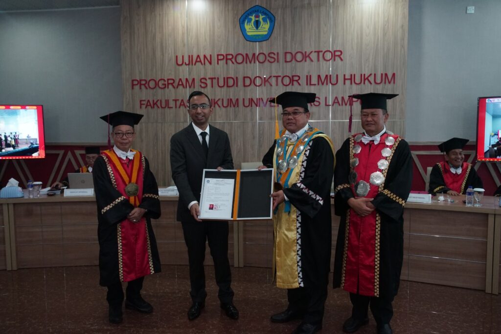 (Unila): Fakultas Hukum (FH) Universitas Lampung (Unila) kembali meluluskan seorang doktor. Artha Ario Putranto resmi meraih gelar doktor setelah dinyatakan lulus dalam Sidang Terbuka Promosi Doktor Program Studi Doktor Ilmu Hukum Unila, Senin, 11 Agustus 2025.