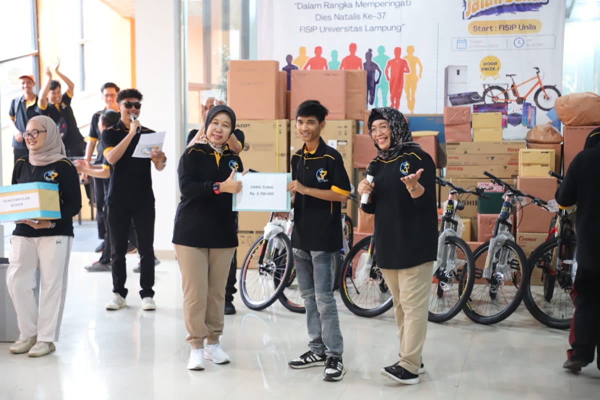 Acara ditutup dengan pembagian door prize bagi para peserta yang beruntung. Door prize yang disiapkan di antaranya uang tunai, kulkas, mesin cuci, sepeda. Puncak Dies Natalis ke-37 FISIP akan dilaksanakan pada 23 Oktober mendatang. [Daffa Alsa/Magang_Zukhruffina Wilda Brilliant]
